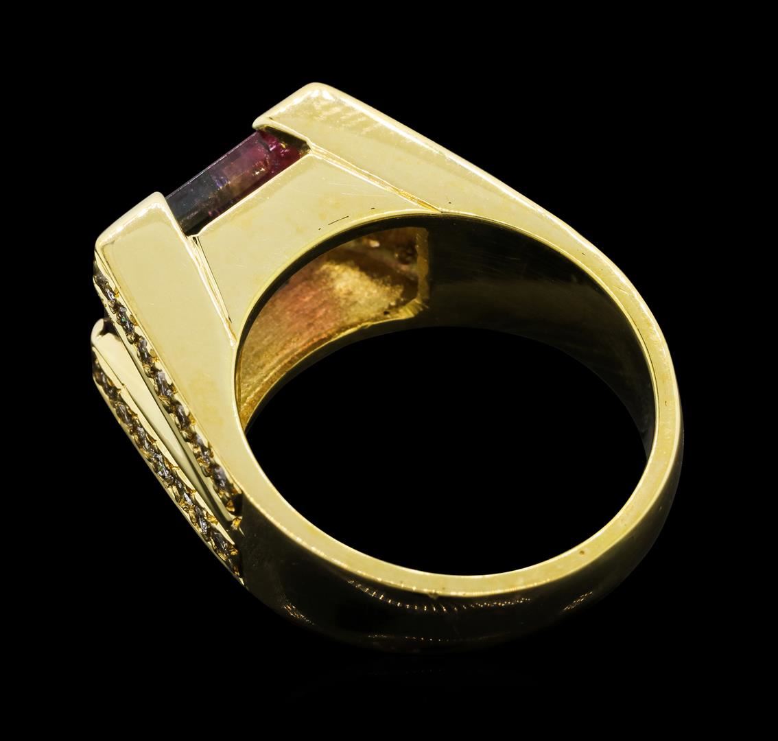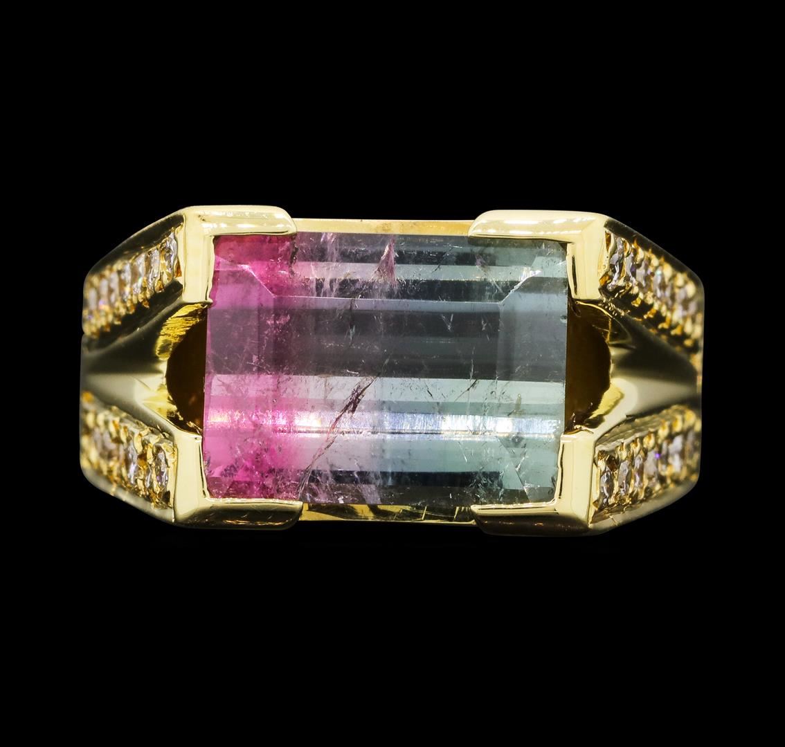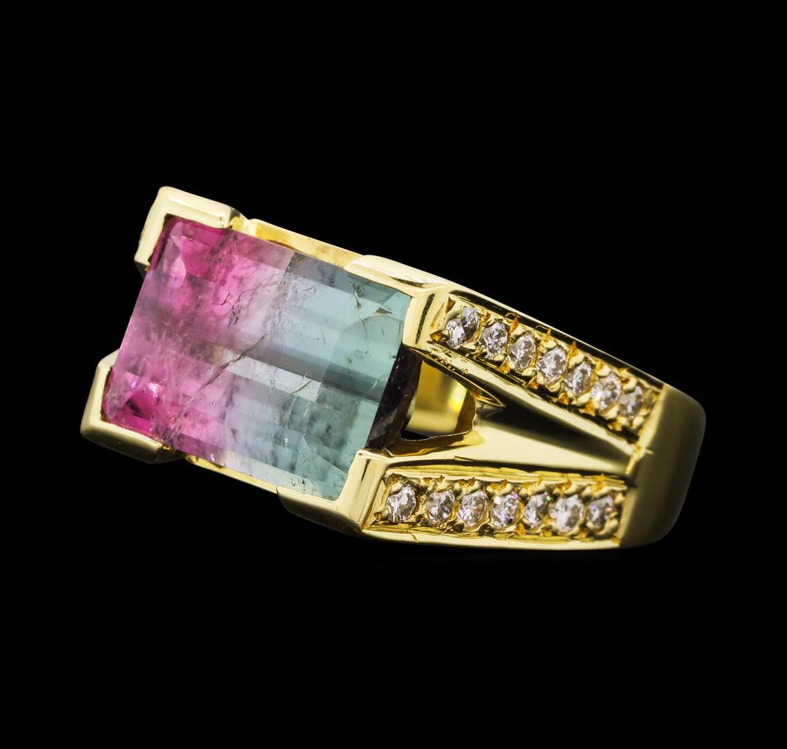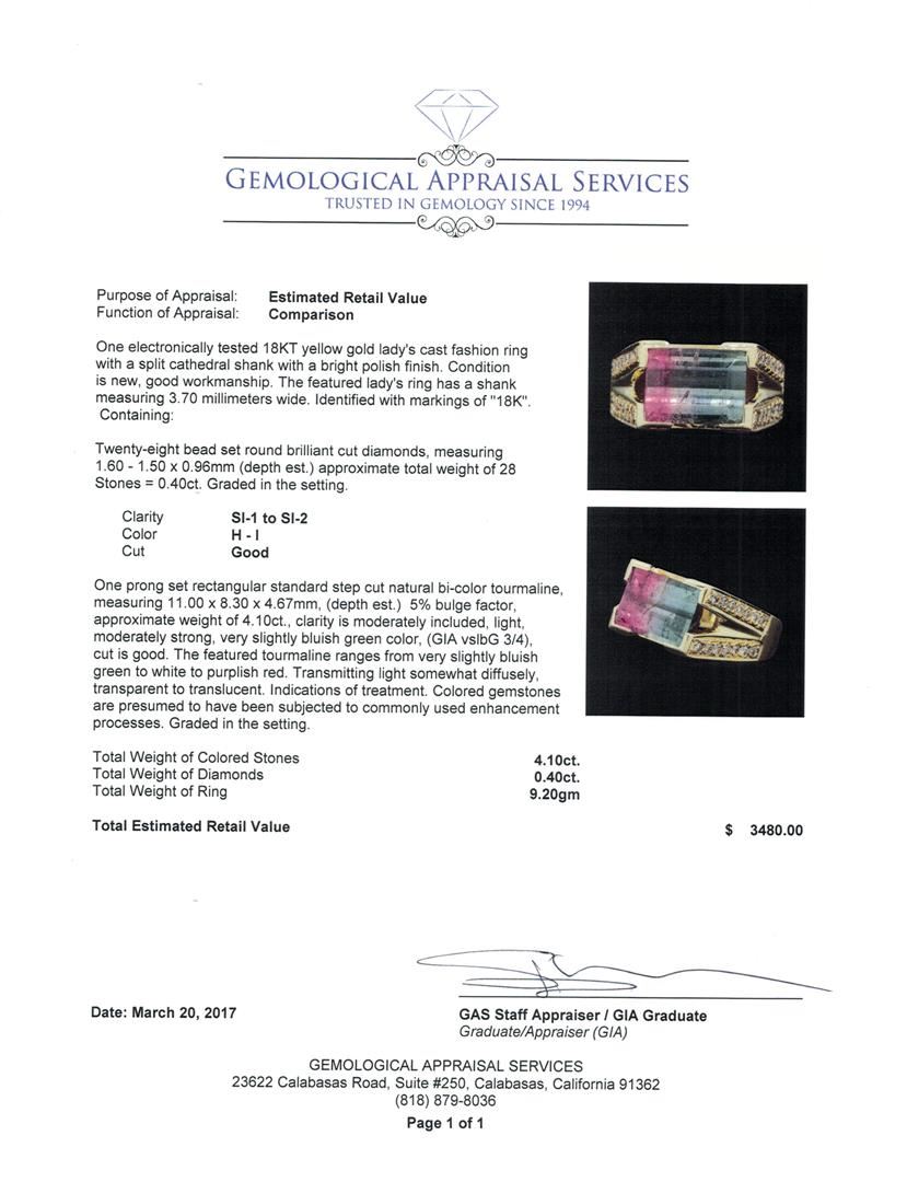 One electronically tested 18KT yellow gold lady's cast fashion ring with a split cathedral shank with a bright polish finish. The featured lady's ring has a shank measuring 3.70 millimeters wide. Identified with markings of '18K'. Condition is new, good workmanship. Containing: Twenty-Eight bead set round brilliant cut diamonds, measuring 1.60 - 1.50 x 0.96mm (depth est.) approximate total weight of 28 Stones = 0.40ct. Graded in the setting. Color H - I Clarity SI-1 to SI-2 Cut Good One prong set rectangular standard step cut natural bi-color tourmaline, measuring 11.00 x 8.30 x 4.67mm, (depth est.) 5%. bulge factor, approximate weight of 4.10ct., clarity is moderately included, light, moderately strong, very slightly bluish green color, (GIA vslbG 3/4), cut is good. The featured tourmaline ranges from very slightly bluish green to white to purplish red. Transmitting light somewhat diffusely, transparent to translucent. Indications of treatment. Colored gemstones are presumed to have been subjected to commonly used enhancement processes. Graded in the setting. Total Weight of Colored Stones 4.10ct.. Total Weight of Diamonds 0.40ct.. Total Weight of Ring 9.20gm GAS Appraised.