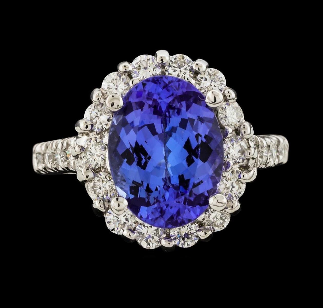One electronically tested 14KT white gold lady's cast fashion ring with a cathedral shank with a basket halo with a bright polish finish. The featured lady's ring has a shank measuring 1.53 millimeters wide. Identified with markings of '14K'. Condition is new, good workmanship. Containing: One prong set oval modified brilliant cut natural tanzanite, measuring 11.87 x 9.00 x 5.53mm, (depth est.) approximate weight of 4.13ct., clarity is eye clean, medium light, moderately strong, violetish blue color, (GIA vB 4/4), cut is good. Transmitting light with no distortion, transparent. Colored gemstones are presumed to have been subjected to commonly used enhancement processes. Graded in the setting. Fourteen prong set round brilliant cut diamonds, measuring 2.40 - 2.35 x 1.48mm (depth est.) approximate total weight of 14 Stones = 0.71ct. Graded in the setting. Clarity SI-1 to SI-2. Color: G - H Cut Good Eight prong set round brilliant cut diamonds, measuring 1.80 - 1.75 x 1.10mm (depth est.) approximate total weight of 8 Stones = 0.17ct. Graded in the setting. Clarity SI-1 to SI-2. Color: G - H Cut Good. Total Weight of Colored Stones 4.13ct.. Total Weight of Diamonds 0.88ct.. Total Weight of Ring 6.00gm. GAS Appraised.