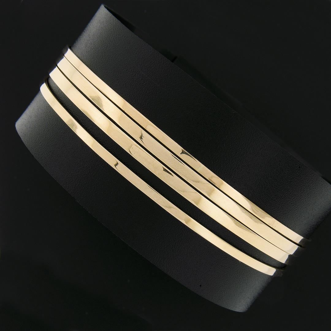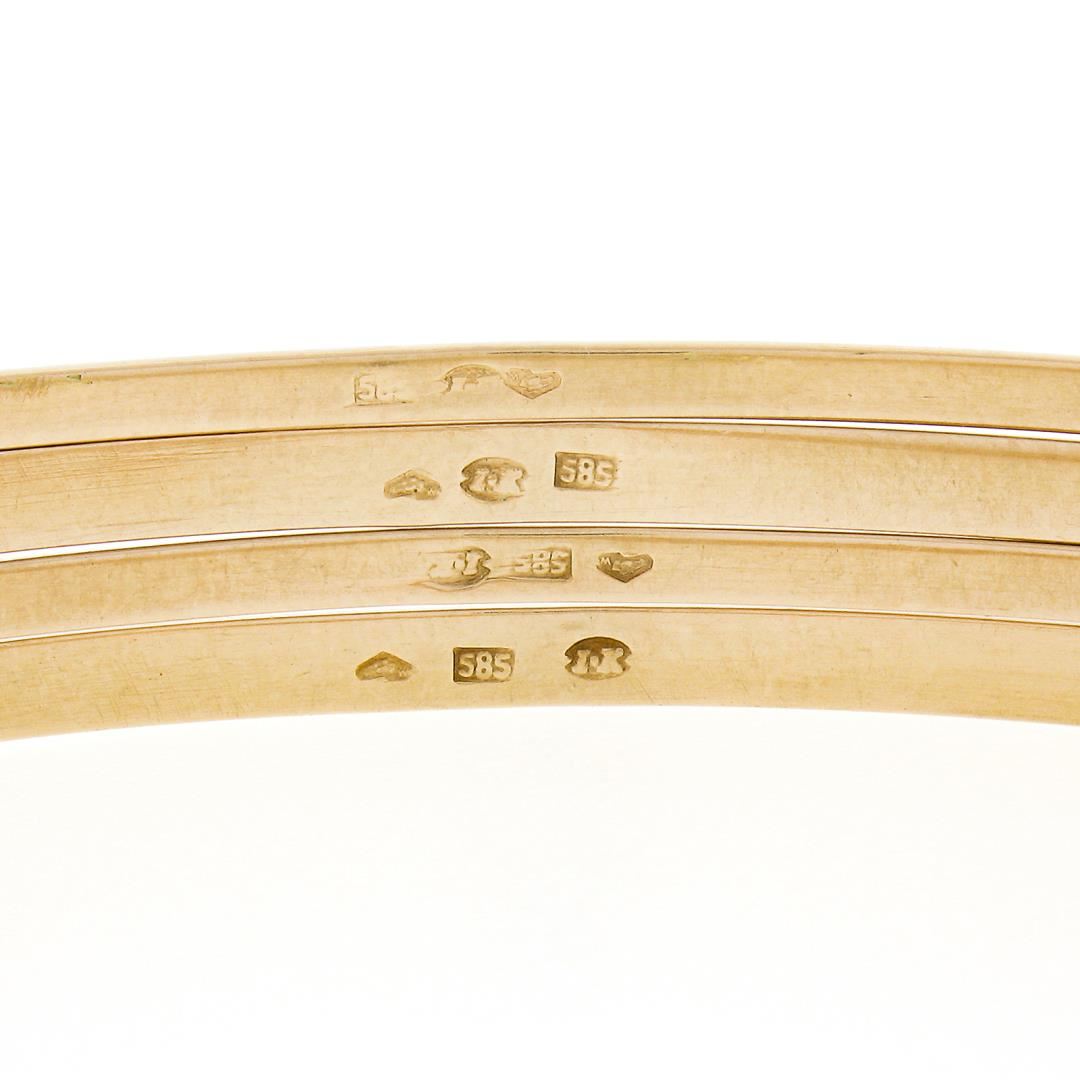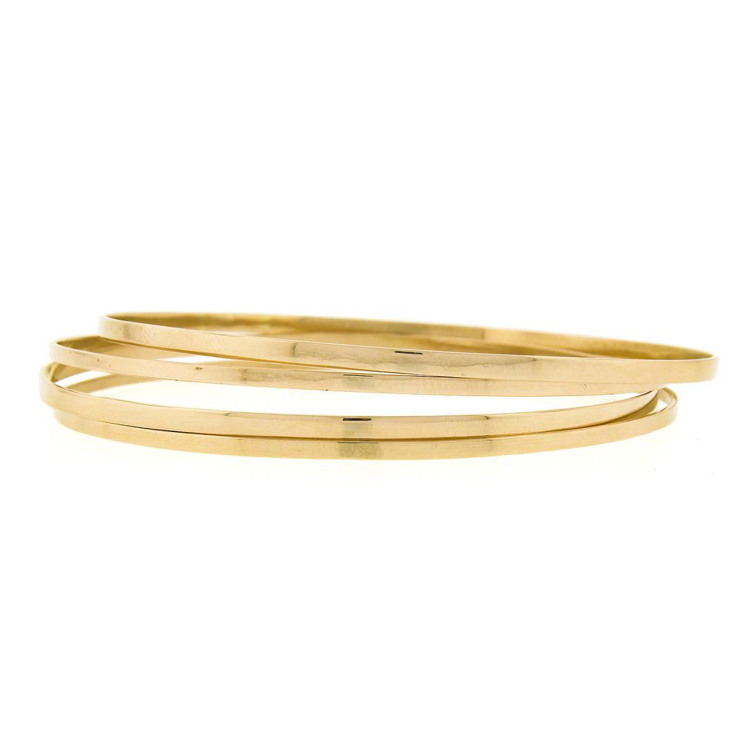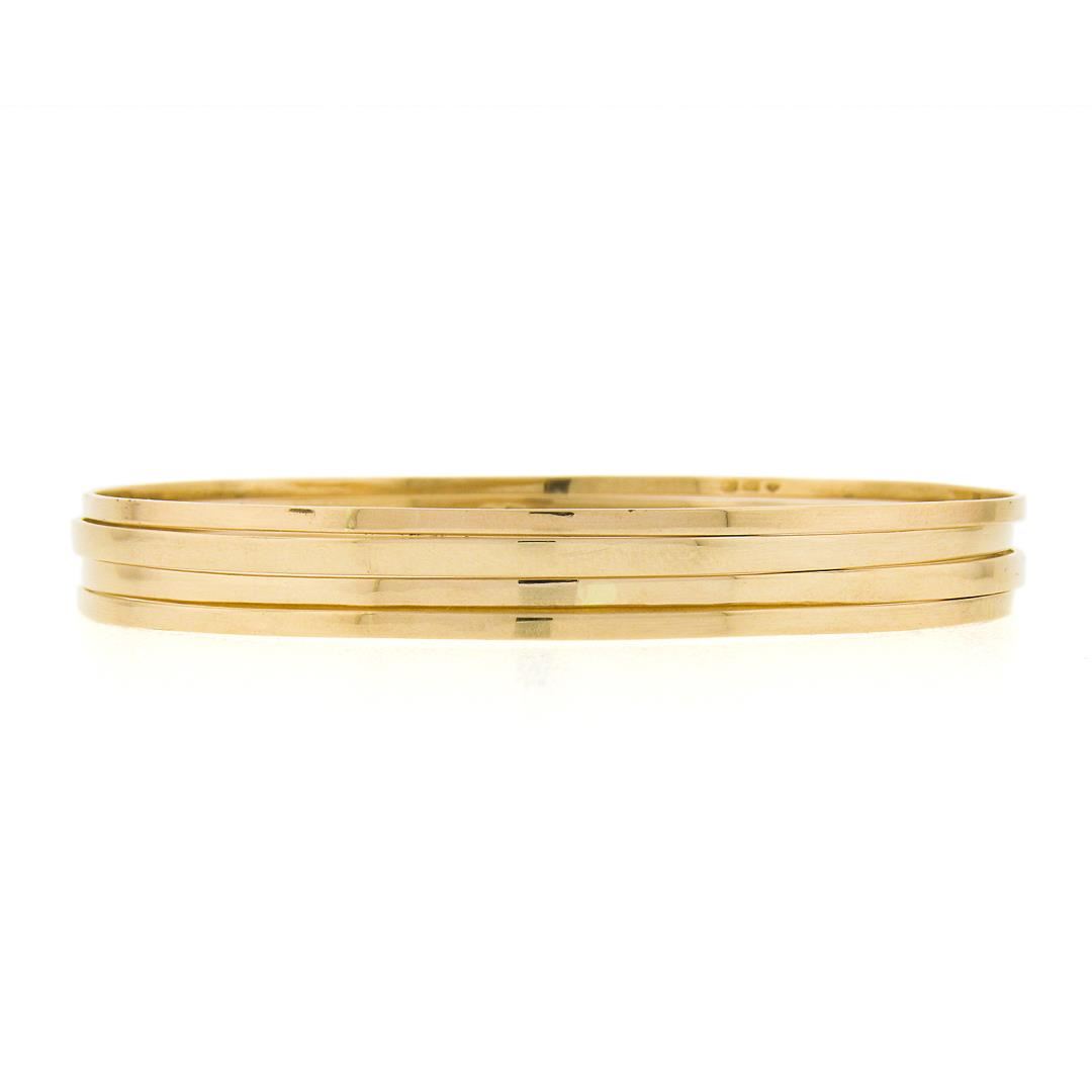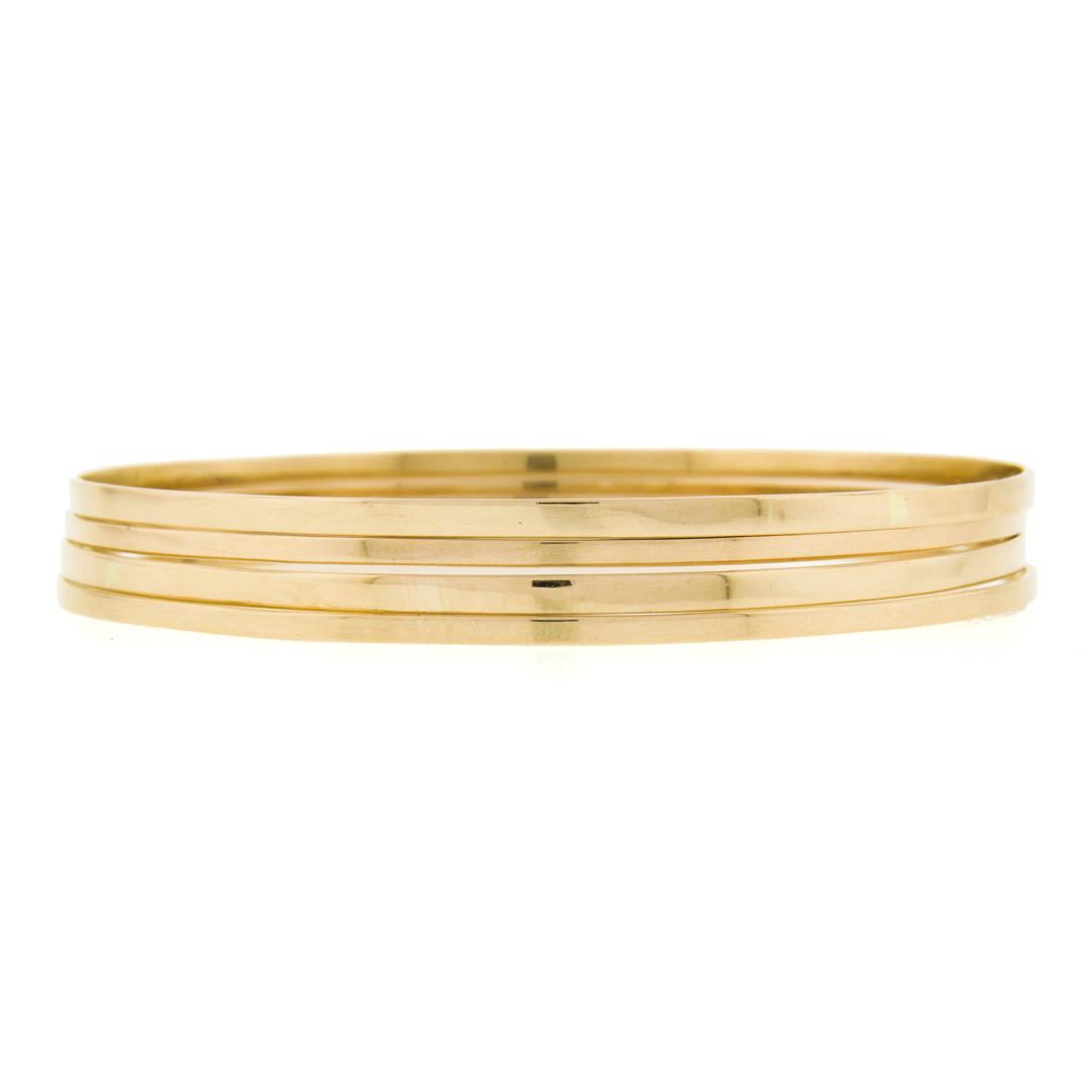 A set of 4 14k yellow gold slip on stack bangle bracelets. It weighs a total of 20.70 grams, measures (2) 2.65mm & (2) 2mm wide, and measures 8.5 inches in length.
