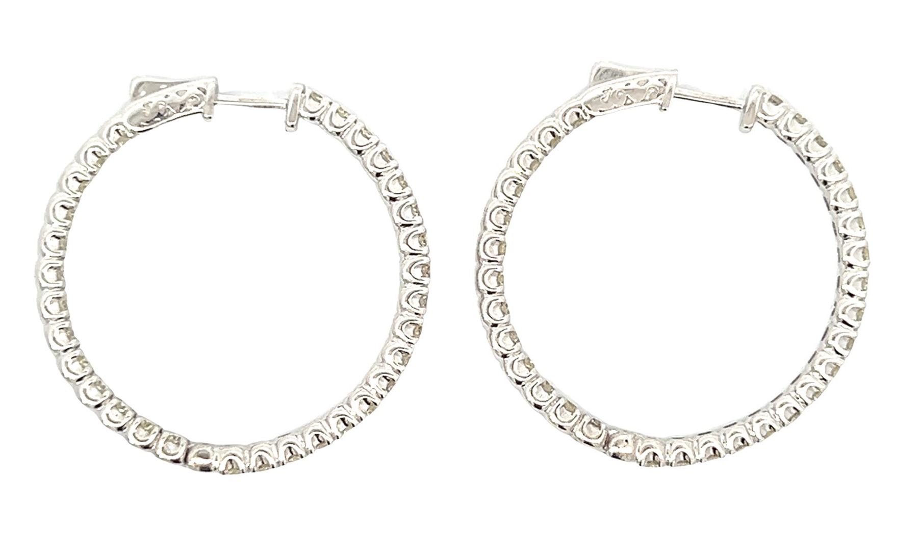 One pair electronically tested 14KT white gold lady's combination cast & assembled fashion inside-out hoop earrings with hinged, snap locking posts with a bright polish finish. The featured hoop earring has a diameter of 36.00 millimeter. Identified with markings of "14K". Condition is new, good workmanship. Containing: Sixty-Two prong set round brilliant cut diamonds, measuring 2.60 - 2.45 x 1.62mm (depth est.) approximate total weight of 62 Stones = 4.15ct. Graded in the setting. Color I - J Clarity VS-2 to SI-1 Cut Very Good Total Weight of Diamonds 4.15ct. Total Weight of Earrings 12.40gm Estimated Retail Value $ 14150.00