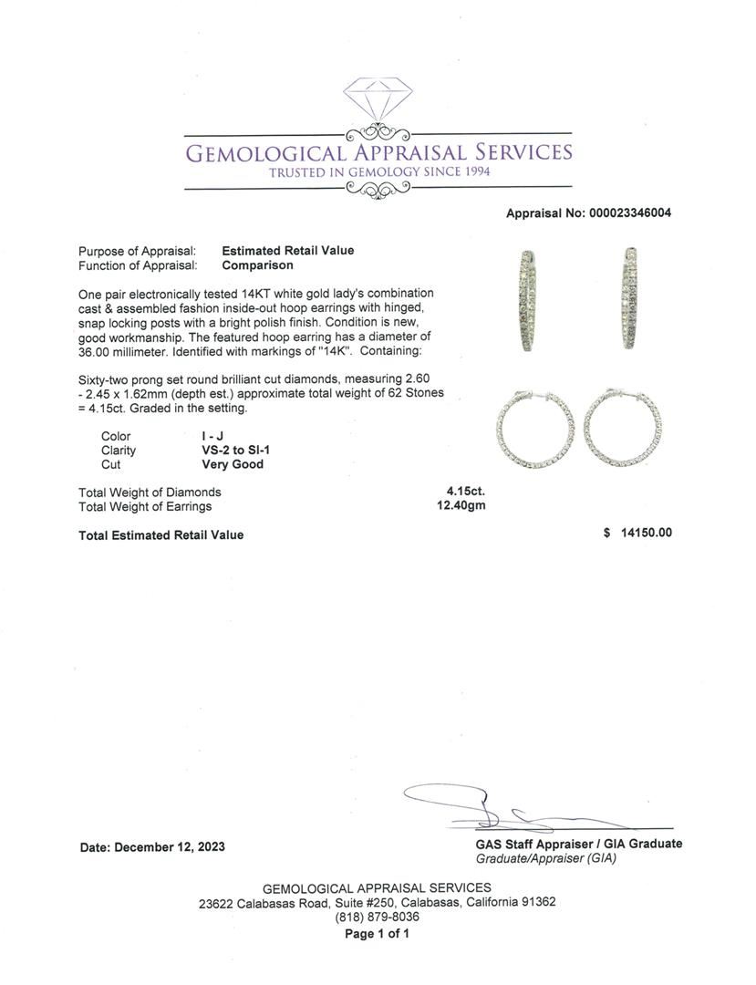 One pair electronically tested 14KT white gold lady's combination cast & assembled fashion inside-out hoop earrings with hinged, snap locking posts with a bright polish finish. The featured hoop earring has a diameter of 36.00 millimeter. Identified with markings of "14K". Condition is new, good workmanship.Containing: Sixty-Two prong set round brilliant cut diamonds, measuring 2.60 - 2.45 x 1.62mm (depth est.) approximate total weight of 62 Stones = 4.15ct. Graded in the setting.Color I - JClarity VS-2 to SI-1 Cut Very Good Total Weight of Diamonds 4.15ct. Total Weight of Earrings 12.40gm Estimated Retail Value 14150