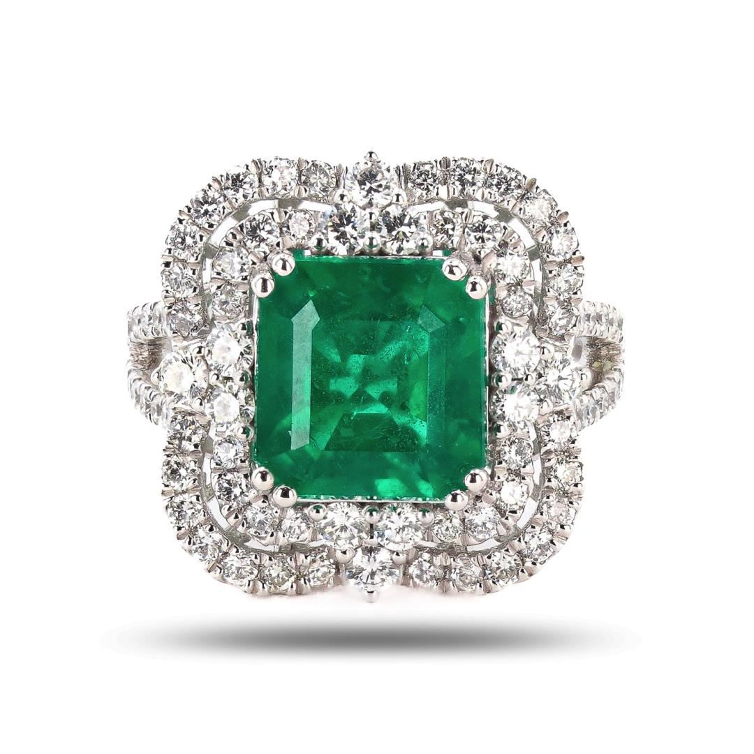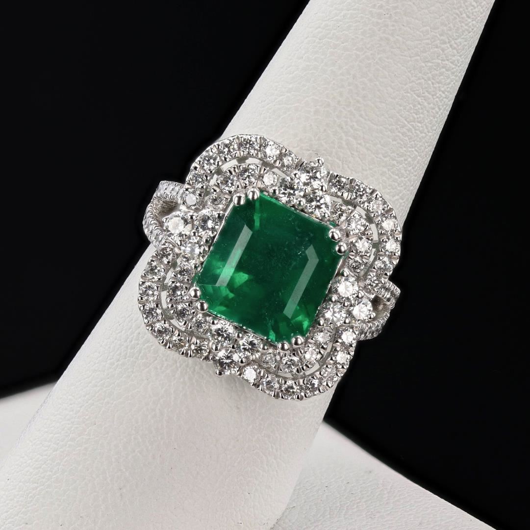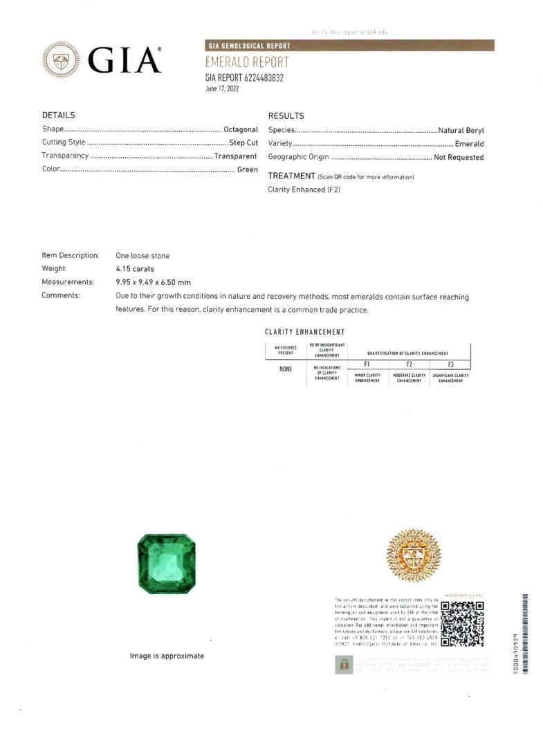 One polished. stamped. and tested platinum ring marked Oscar Friedman. The ring is mounted with 1 genuine GIA certified emerald center stone weighing 4.15 carats, and 92 genuine round diamonds weighing approximately 1.38 carats. This item weighs 13.9 grams, condition is new, excellent workmanship. #MAIN GEMSTONE# GIA Report No.: 6224483832 Species: Natural Beryl Variety: Emerald Shape: Octagonal Cutting Style: Step Cut Measurements: 9.95 x 9.49 x 6.50mm Weight: 4.15 carats Color: Green Transparency: Transparent Treatment: Clarity Enhanced (F2) Refractive Index: 1.564 - 1.595 DR Birefringence: 0.005 to 0.009 Hardness: 7.5 - 8 #ADJACENT GEMSTONES ON RING# Identity: Natural Diamond Shape: Round Cutting Style: Brilliant Cut Quantity: 92 Diamonds Measurements: 1.3 - 2.0mm Total Weight: 1.38 carats Color Grade: F-G Clarity Grade: VS2-SI1 Refractive Index: 2.417 Hardness: 10 EMERALD WEIGHT: 4.15 ct TOTAL DIAMOND WEIGHT: 1.38 cts WEIGHT OF ITEM: 13.9 grams METAL: Platinum #LREF-18521