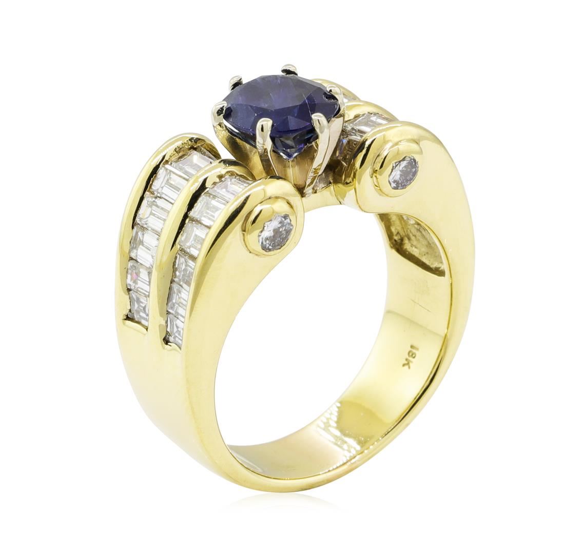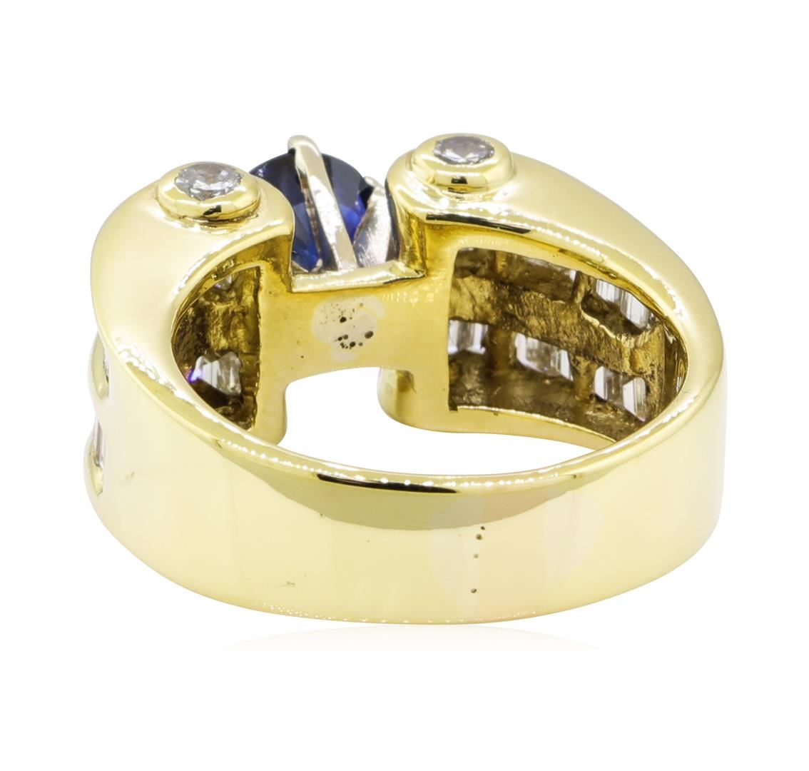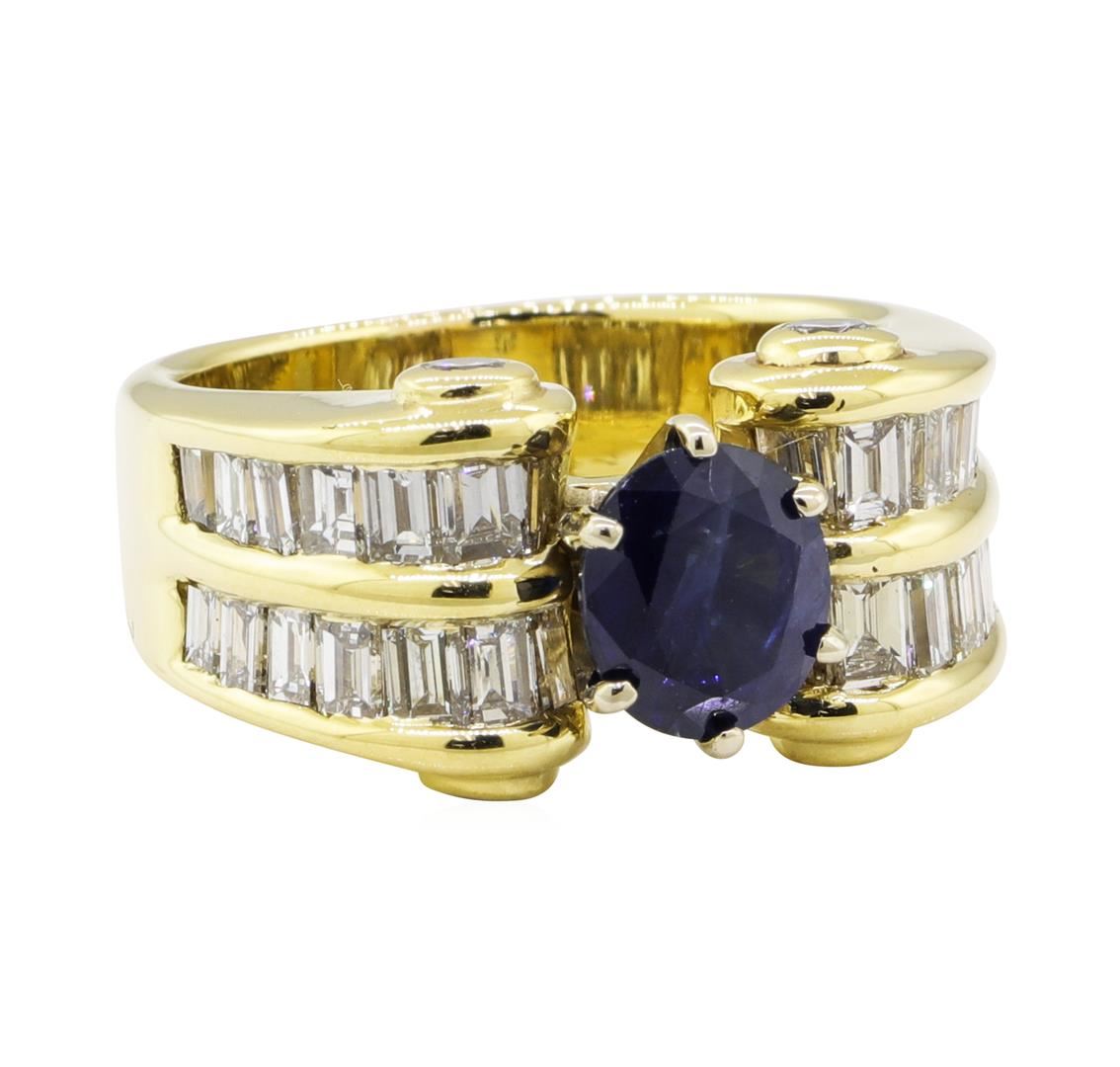 One electronically tested 18KT yellow gold lady's combination cast & assembled fashion ring with a cathedral wide band with a bright polish finish. The featured lady's ring has a shank measuring 6.00 millimeters wide. Identified with markings of '18K'. Condition is like new, good workmanship. Containing: One prong set oval modified mixed cut natural blue sapphire, measuring 7.80 x 6.77 x 4.20mm, (depth est.) approximate weight of 1.86ct., clarity is moderately included, dark, moderately strong, blue color, (GIA B 7/4), cut is good. Transmitting light somewhat diffusely, transparent to translucent. Colored gemstones are presumed to have been subjected to commonly used enhancement processes. Graded in the setting. Twenty-Eight channel set baguette cut (tapered) diamonds, measuring from 2.30 x 1.70 x 1.45mm (depth est.) to 3.00 x 2.00 x 1.70mm (depth est.) approximate total weight of 28 Stones = 2.00ct. Graded in the setting. Color F - G Clarity VS-1 to VS-2 Cut Very Good Four bezel set round brilliant cut diamonds, measuring 2.70 - 2.60 x 1.64mm (depth est.) approximate total weight of 4 Stones = 0.30ct. Graded in the setting. Color F - G Clarity VS-1 to VS-2 Cut Very Good. Total Weight of Colored Stones 1.86ct.. Total Weight of Diamonds 2.30ct.. Total Weight of Ring 14.90gm GAS Appraised at $9745.00. GAS Appraised.