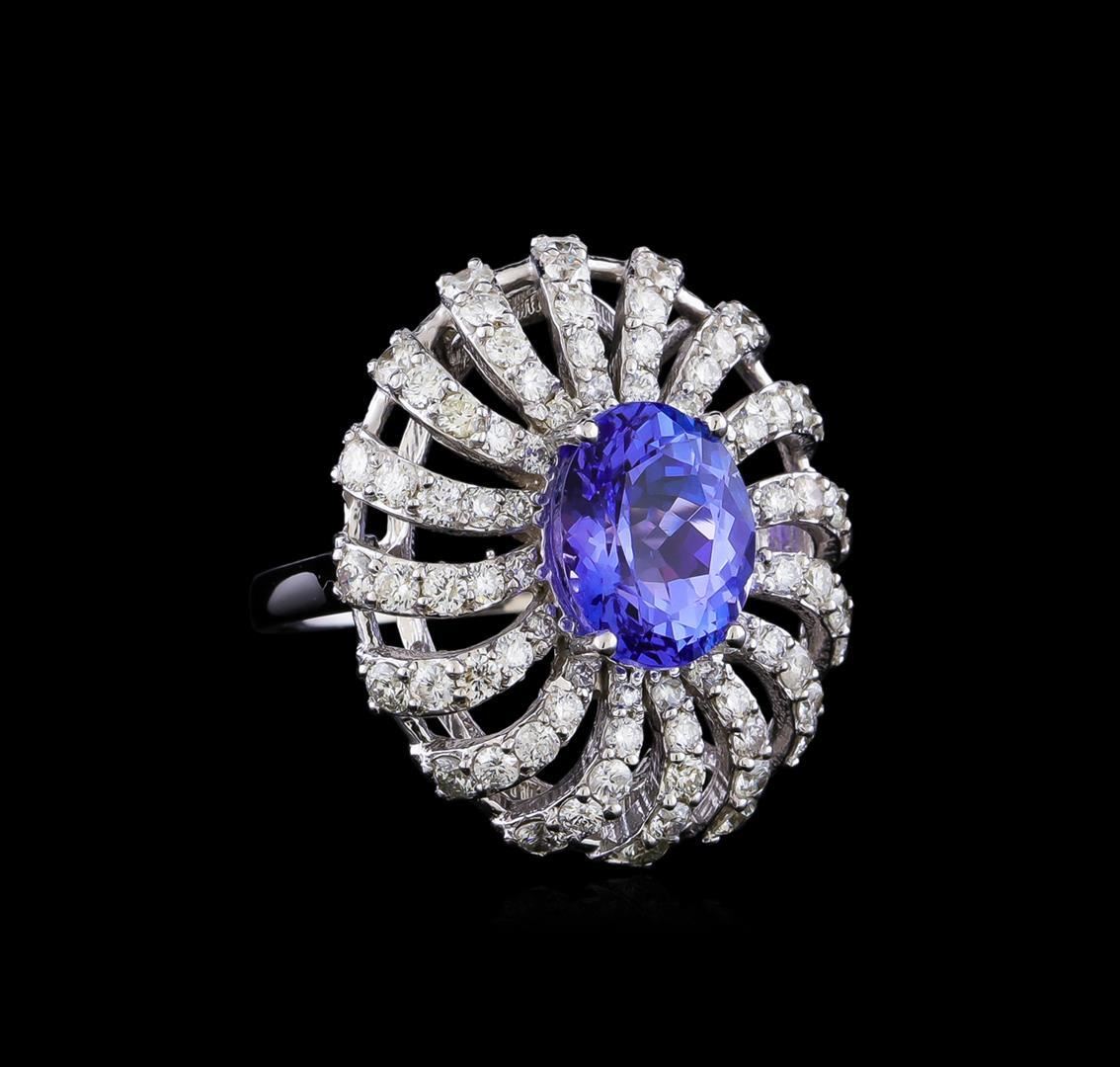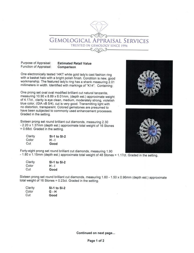 One electronically tested 14KT white gold lady's cast fashion ring with a basket halo with a bright polish finish. The featured lady's ring has a shank measuring 2.01 millimeters in width. Identified with markings of "K14". Condition is new, good workmanship. Containing: One prong set oval oval modified brilliant cut natural tanzanite, measuring 10.90 x 8.89 x 6.01mm, (depth est.) approximate weight of 4.17ct., clarity is eye clean, medium, moderately strong, violetish blue color, (GIA vB 5/4), cut is very good. Transmitting light with no distortion, transparent. Colored gemstones are presumed to have been subjected to commonly used enhancement processes. Graded in the setting. Sixteen prong set round brilliant cut diamonds, measuring 2.30 - 2.20 x 1.37mm (depth est.) approximate total weight of 16 Stones = 0.68ct. Graded in the setting. Clarity: SI-1 to SI-2. Color: H - I. Cut Good Forty-Eight prong set round brilliant cut diamonds, measuring 1.90 - 1.80 x 1.15mm (depth est.) approximate total weight of 48 Stones = 1.17ct. Graded in the setting. Clarity: SI-1 to SI-2. Color: H - I. Cut Good Sixteen prong set round brilliant cut diamonds, measuring 1.60 - 1.50 x 0.96mm (depth est.) approximate total weight of 16 Stones = 0.23ct. Graded in the setting. Clarity: SI-1 to SI-2. Color: G - Good. Total Weight of Colored Stones 4.17ct. Total Weight of Diamonds 2.08ct. Total Weight of Ring 9.70gm. GAS Appraised.