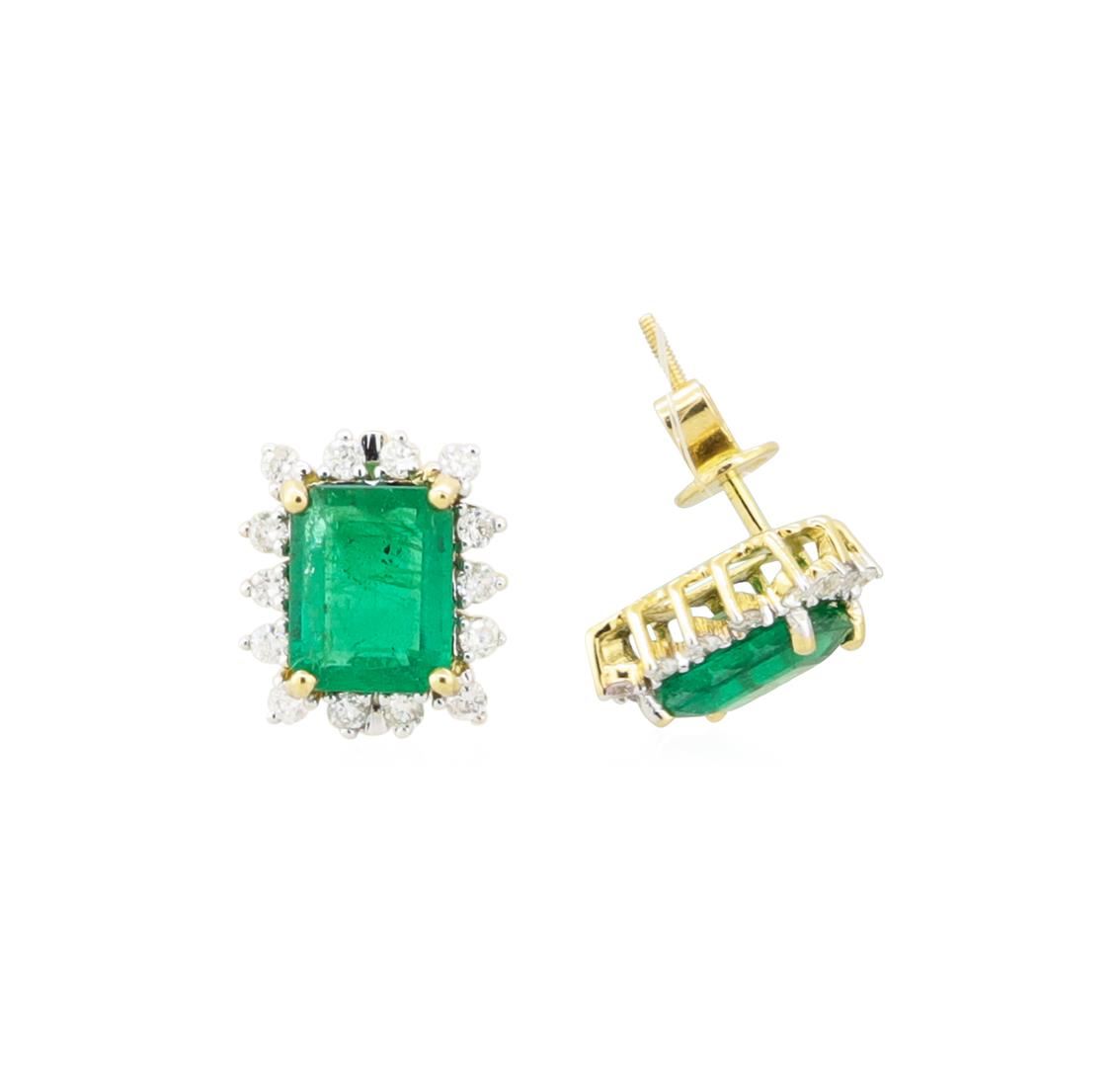One pair electronically tested 18KT yellow gold ladies cast & assembled emerald & diamond earrings with screw backs. Each earring features an emerald set within a diamond floret. Bright polish finish with rhodium accents. Trademark is Orianne. Identified with markings of "18K". Condition is new, good workmanship. Containing: Two prong set rectangular step cut natural emeralds, measuring 8.80 x 6.90 x 4.10mm, exact total weight 4.18ct., clarity is moderately included, type III, medium, moderately strong, very slightly bluish green color, (GIA vslbG 5/4), cut is good. Transmitting light somewhat diffusely, transparent to translucent. Naturally occurring internal & external characteristics are present. Measurements are an average for the pair. Graded in the setting. Twenty-Eight prong set round brilliant cut diamonds exact total weight 28 Stones = 0.63ct. Graded in the setting. Clarity I-1 to I-2 Color G - I Total Weight of Colored Stones 4.18 ct. Total Weight of Diamonds 0.63 ct. Total Weight of Earrings 5.00 gm Estimated Retail Value $ 28,200.00 US