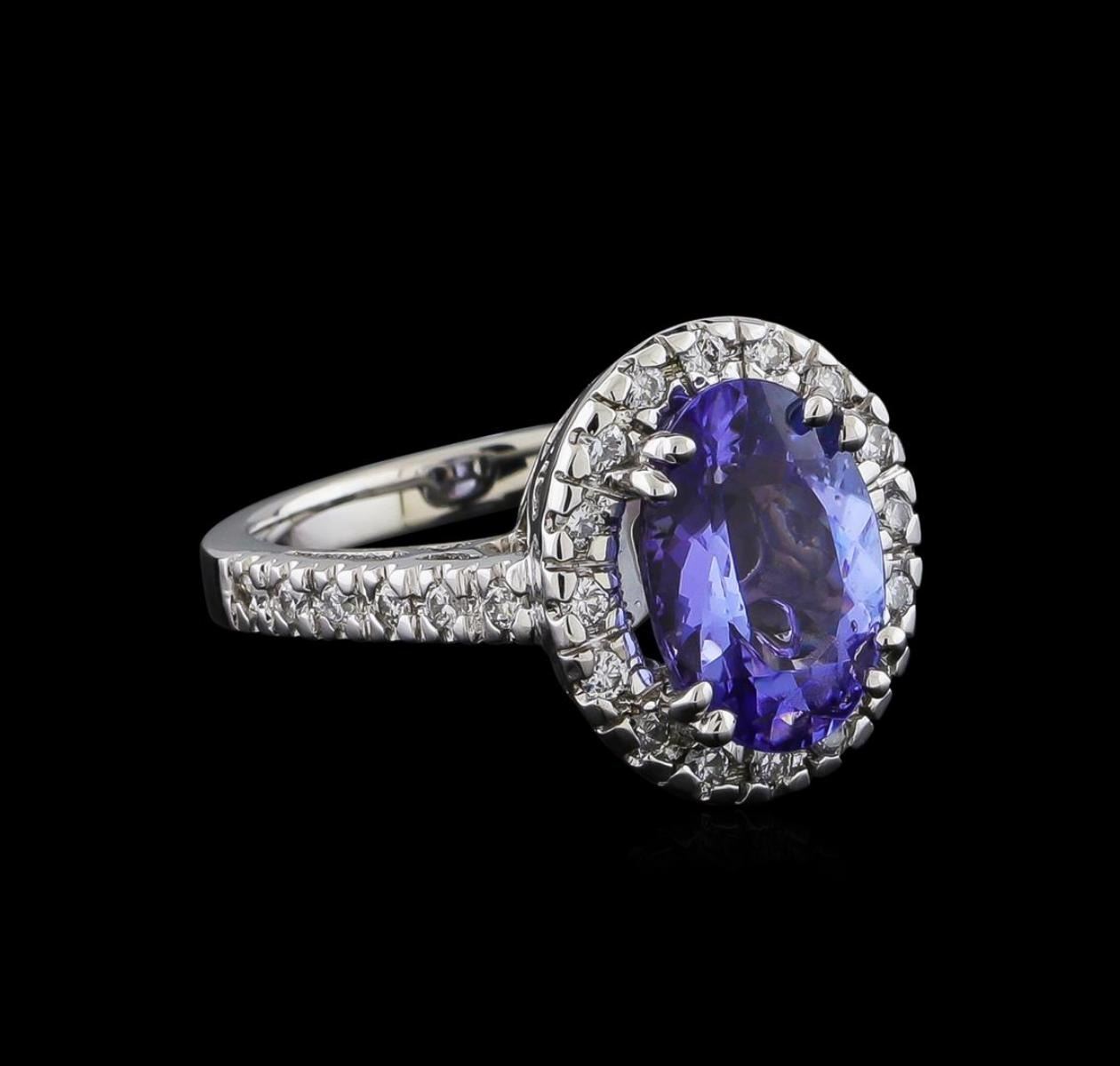 One electronically tested 14KT white gold lady's cast fashion ring with a basket halo with a bright polish finish. The featured lady's ring has a shank measuring 2.57 millimeters wide. Identified with markings of "14K". Condition is new, good workmanship. Containing: One prong set oval modified brilliant cut natural tanzanite, measuring 12.33 x 8.86 x 5.55mm, approximate weight of 4.18ct., clarity is eye clean, type I, medium, moderately strong, bluish violet color, (GIA bV 5/4), cut is very good. Transmitting light with no distortion, transparent. Colored gemstones are presumed to have been subjected to commonly used enhancement processes. Graded in the setting. Twenty-Eight prong set round brilliant cut diamonds, measuring 1.75 - 1.65 x 1.05mm (depth est.) approximate total weight of 28 Stones = 0.52ct. Graded in the setting. Clarity: SI-1 to SI-2. Color: H - I. Cut Good. Total Weight of Colored Stones 4.18ct. Total Weight of Diamonds 0.52ct. Total Weight of Ring 7.90gm. GAS Appraised at $8,930.00.