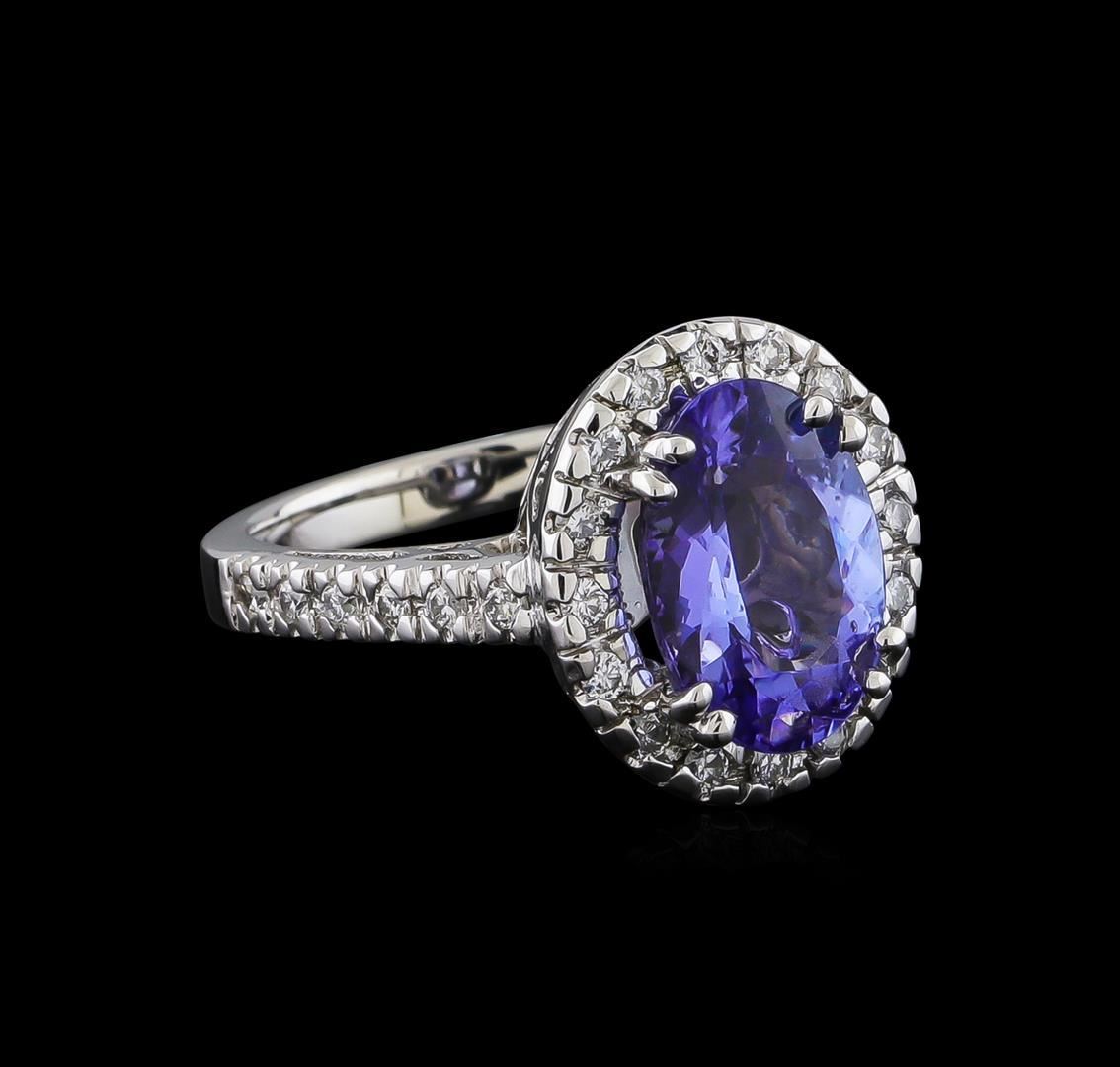One electronically tested 14KT white gold lady's cast fashion ring with a basket halo with a bright polish finish. The featured lady's ring has a shank measuring 2.57 millimeters wide. Identified with markings of "14K". Condition is new, good workmanship. Containing: One prong set oval modified brilliant cut natural tanzanite, measuring 12.33 x 8.86 x 5.55mm, approximate weight of 4.18ct., clarity is eye clean, type I, medium, moderately strong, bluish violet color, (GIA bV 5/4), cut is very good. Transmitting light with no distortion, transparent. Colored gemstones are presumed to have been subjected to commonly used enhancement processes. Graded in the setting. Twenty-Eight prong set round brilliant cut diamonds, measuring 1.75 - 1.65 x 1.05mm (depth est.) approximate total weight of 28 Stones = 0.52ct. Graded in the setting. Clarity: SI-1 to SI-2. Color: H - I. Cut Good. Total Weight of Colored Stones 4.18ct. Total Weight of Diamonds 0.52ct. Total Weight of Ring 7.90gm. GAS Appraised.