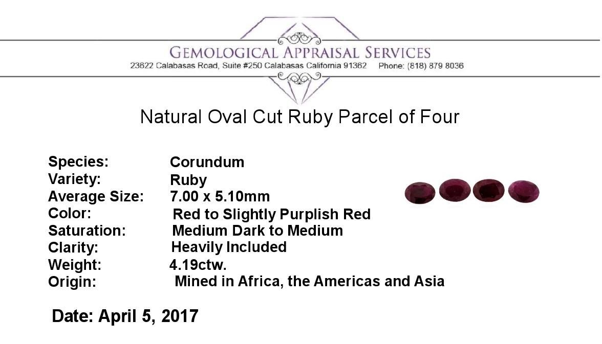 One natural oval cut ruby parcel of four with an exact weight of 4.19ctw., clarity is heavily included, red to slightly purplish red, medium dark to medium. Gemological Appraisals Services estimates the retail value at $628.5 GAS Appraised.
