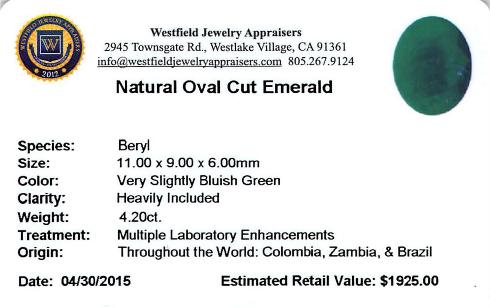One oval cut natural emerald, measuring 11.00 x 9.00 x 6.00mm, exact weight 4.20ct., clarity is heavily included, type III, medium dark, very slightly grayish, very slightly bluish green color, (GIA vslbG 6/3), cut is good. Westfield Appraised.