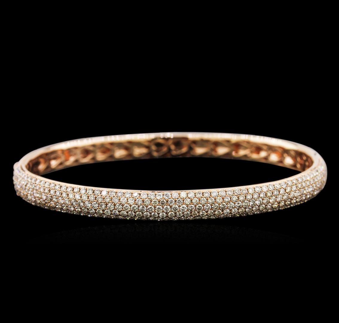 One electronically tested 14KT rose gold lady's combination cast & assembled fashion bangle bracelet with a tongue clasp with foldover safety with a bright polish finish. The featured lady's bangle bracelet has five rows of diamonds and an internal circumference of 7 inches with a width of 6.5 millimeters. Condition is new, good workmanship. Containing: Two Hundred Ninety-Four prong set round brilliant cut diamonds, measuring 1.60 - 1.50 x 0.98mm (depth est.) approximate total weight of 294 Stones = 4.21ct. Graded in the setting. Clarity: VS-2 to SI-2. Color: G - I. Cut Very Good. Total Weight of Diamonds 4.21ct. Total Weight of Bangle Bracelet 19.30gm. GAS Appraised at $15,385.00.