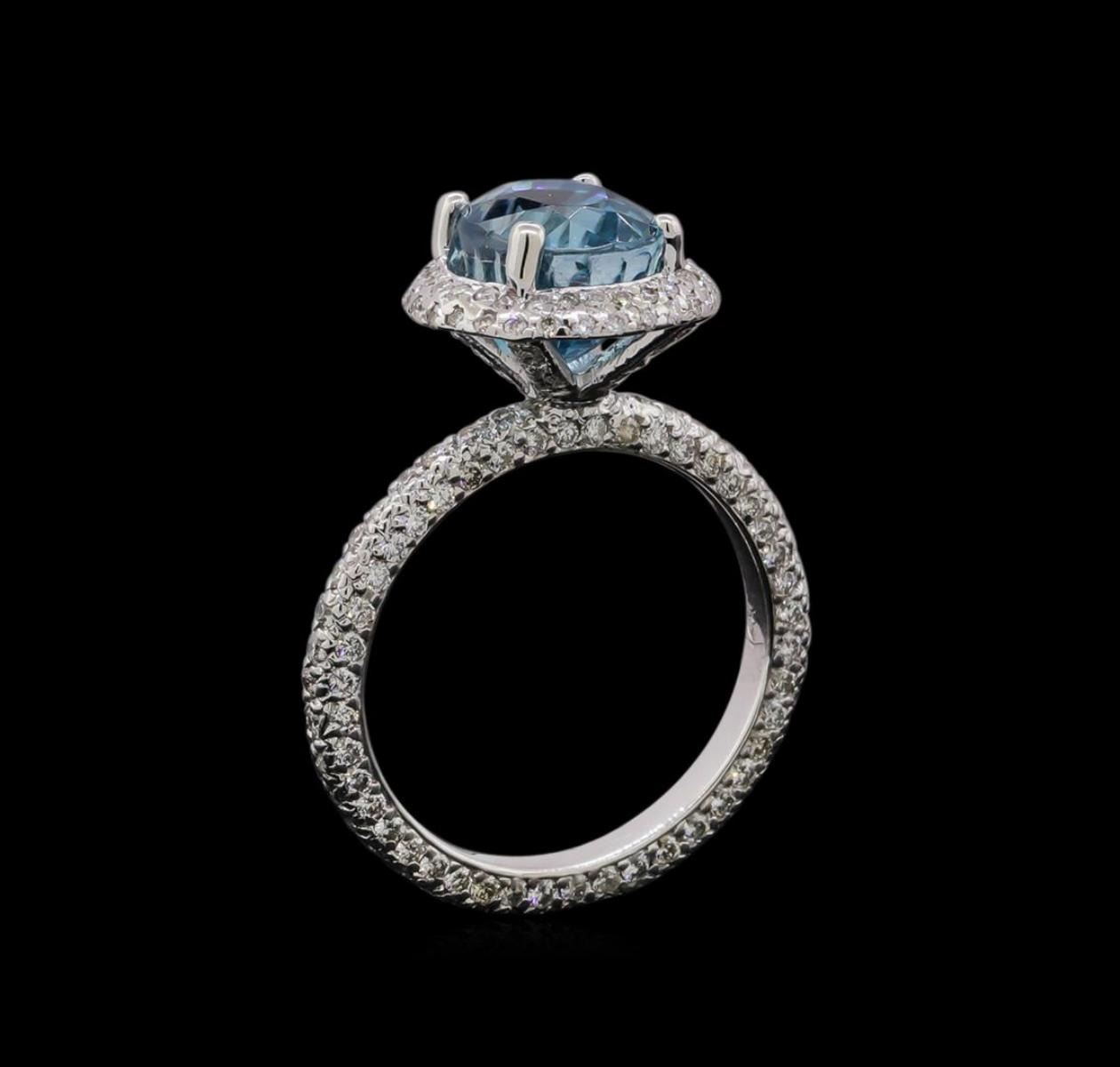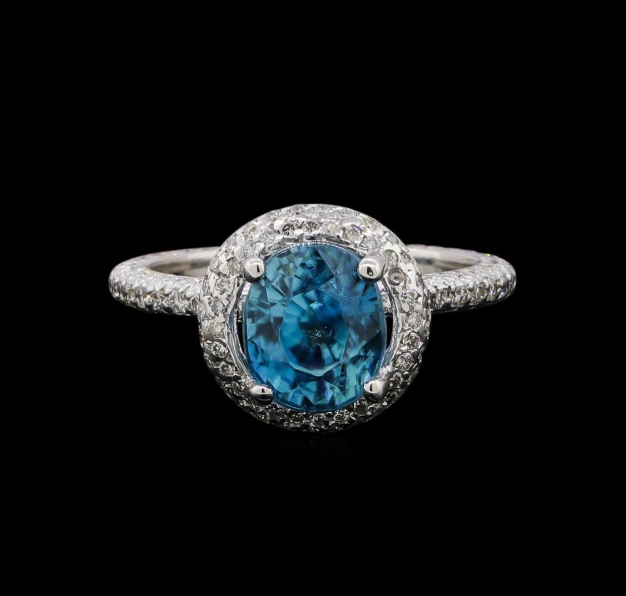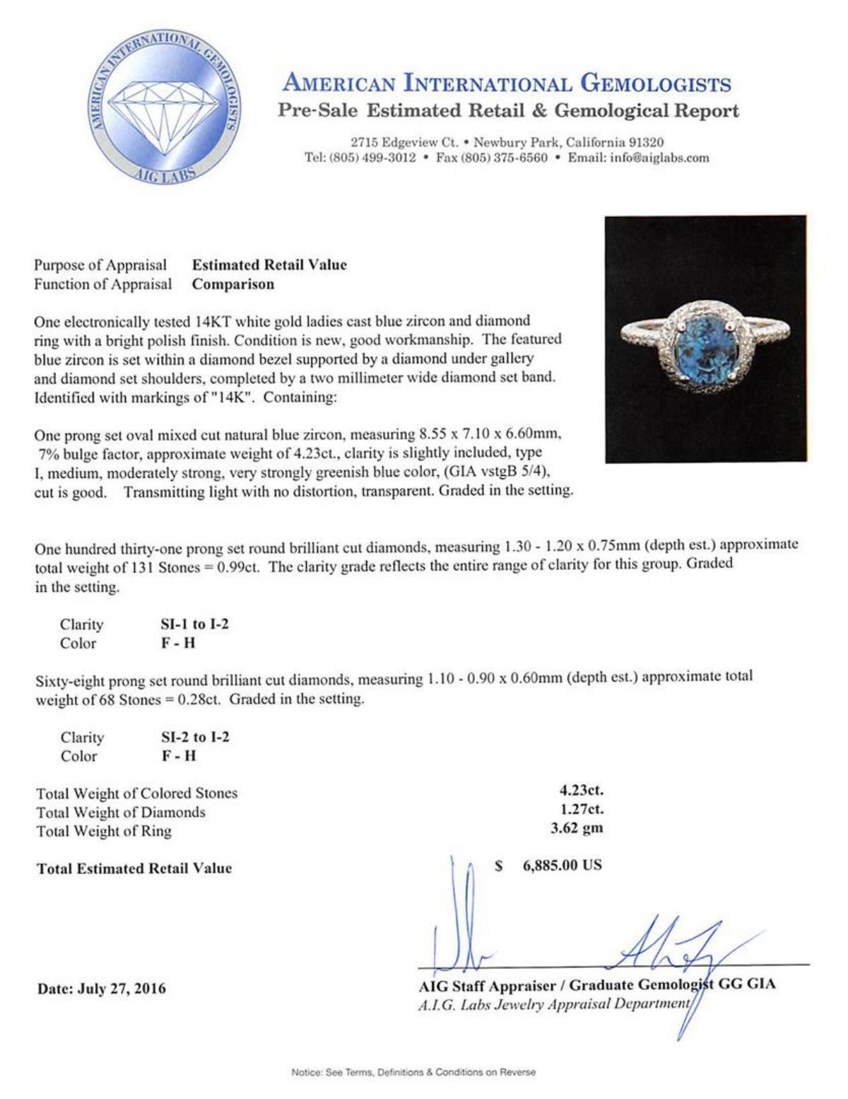 One electronically tested 14KT white gold ladies cast blue zircon and diamond ring with a bright polish finish. The featured blue zircon is set within a diamond bezel supported by a diamond under gallery and diamond set shoulders, completed by a two millimeter wide diamond set band. Identified with markings of '14K'. Condition is new, good workmanship. Containing: One prong set oval mixed cut natural blue zircon, measuring 8.55 x 7.10 x 6.60mm, 7%. bulge factor, approximate weight of 4.23ct., clarity is slightly included, type I, medium, moderately strong, very strongly greenish blue color, (GIA vstgB 5/4), cut is good. Transmitting light with no distortion, transparent. Graded in the setting. One Hundred Thirty-One prong set round brilliant cut diamonds, measuring 1.30 - 1.20 x 0.75mm (depth est.) approximate total weight of 131 Stones = 0.99ct. The clarity grade reflects the entire range of clarity for this group. Graded in the setting. Clarity SI-1 to I-2. Color: F - H Sixty-Eight prong set round brilliant cut diamonds, measuring 1.10 - 0.90 x 0.60mm (depth est.) approximate total weight of 68 Stones = 0.28ct. Graded in the setting. Clarity SI-2 to I-2. Color: F - H. Total Weight of Colored Stones 4.23ct.. Total Weight of Diamonds 1.27ct.. Total Weight of Ring 3.62gm. AIG Appraised.