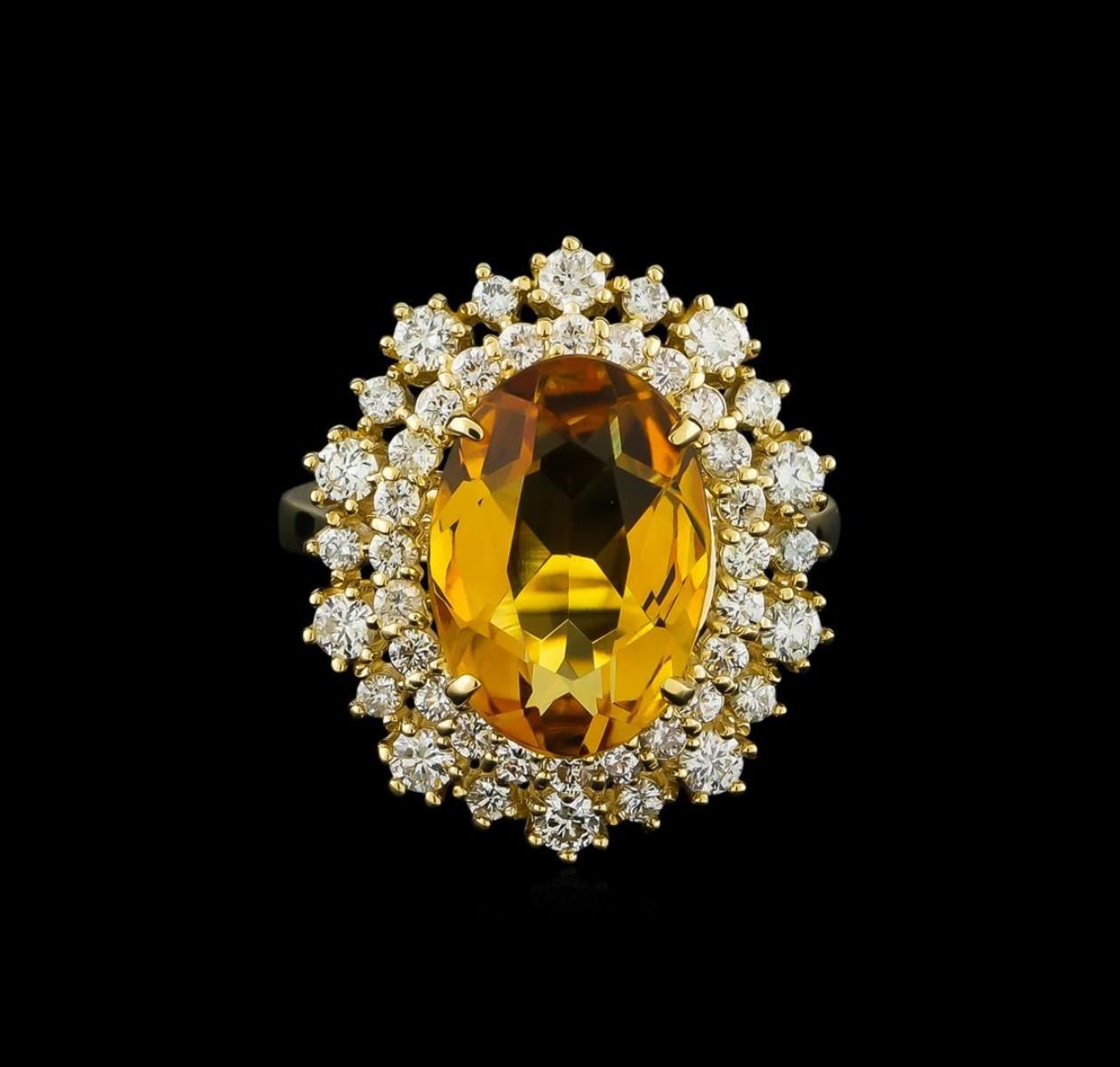 One electronically tested 14KT yellow gold lady's cast fashion ring with a double basket halo with a bright polish finish. The featured lady's ring has a shank measuring 2.79 millimeters wide. Identified with markings of "K14". Condition is new, good workmanship. Containing: One prong set oval modified brilliant cut natural citrine quartz, measuring 14.04 x 9.86 x 5.59mm, approximate weight of 4.23ct., clarity is eye clean, type I, medium dark, moderately strong, yellowish orange color, (GIA yO 6/4), cut is good. Transmitting light with no distortion, transparent. Colored gemstones are presumed to have been subjected to commonly used enhancement processes. Graded in the setting. Ten prong set round brilliant cut diamonds, measuring 2.40 - 2.30 x 1.43mm (depth est.) approximate total weight of 10 Stones = 0.48ct. Graded in the setting. Clarity: SI-1 to SI-2. Color: H - I. Cut Good Thirty-Four prong set round brilliant cut diamonds, measuring 1.70 - 1.60 x 1.02mm (depth est.) approximate total weight of 34 Stones = 0.58ct. Graded in the setting. Clarity: SI-1 to SI-2. Color: H - I. Cut Very Good. Total Weight of Colored Stones 4.23ct. Total Weight of Diamonds 1.06ct. Total Weight of Ring 7.00gm GAS Appraised at $3,585.00.