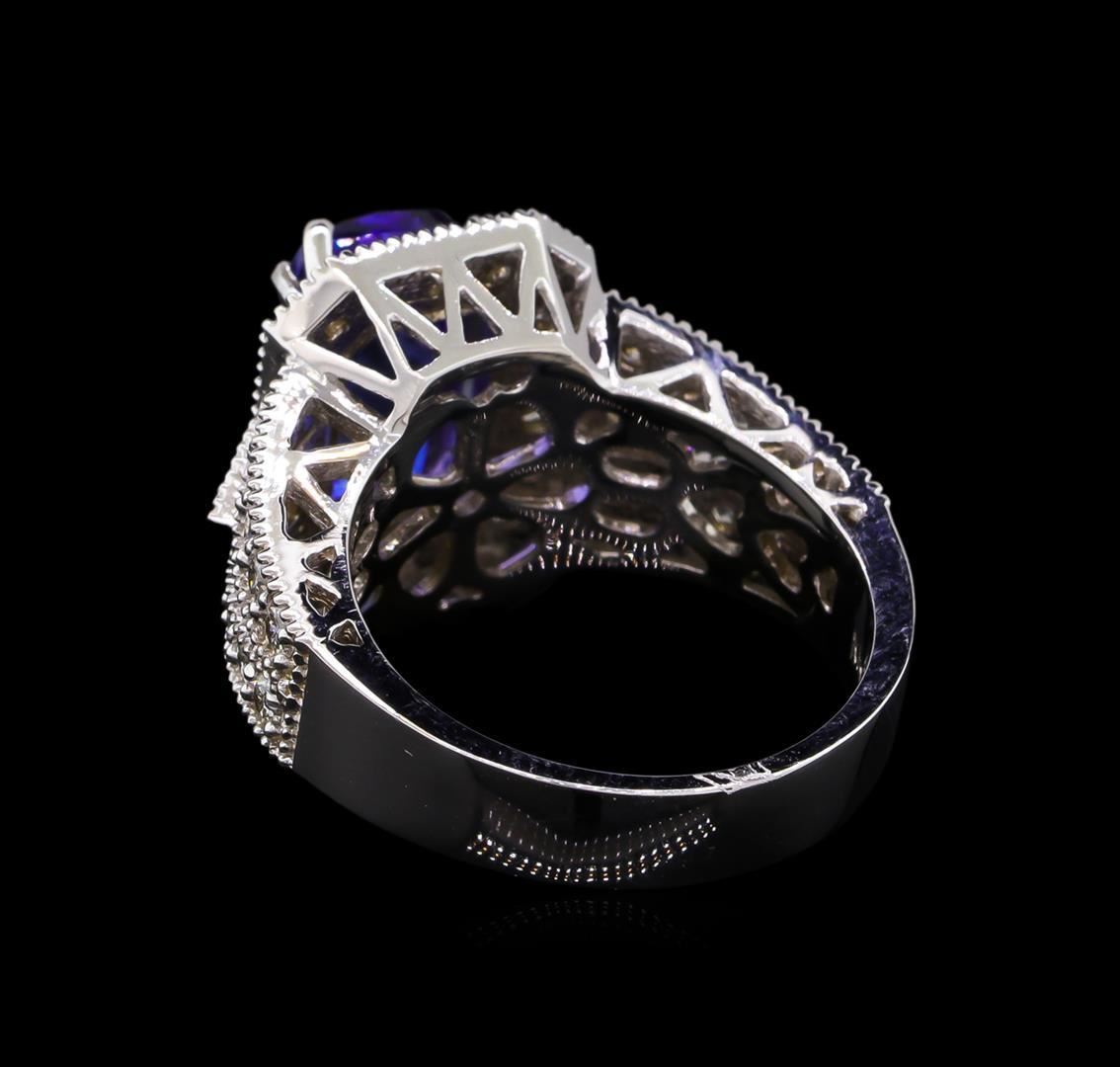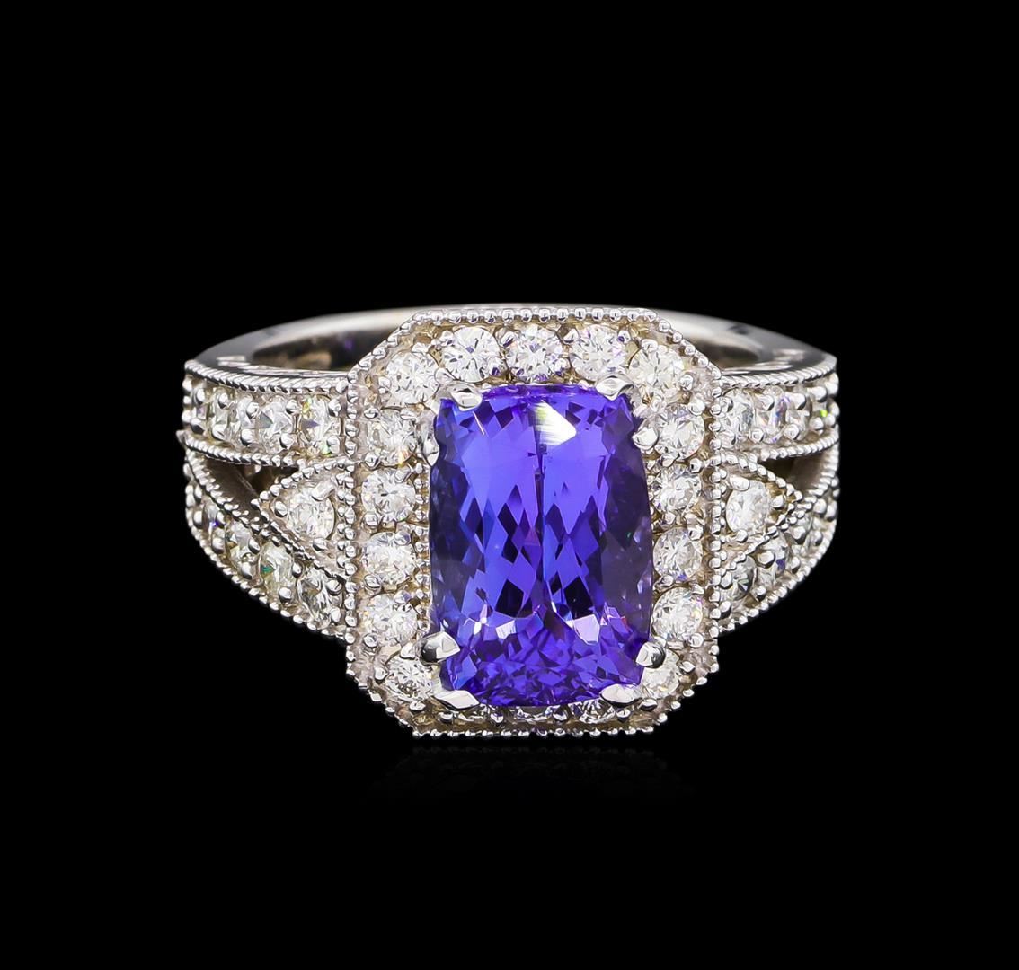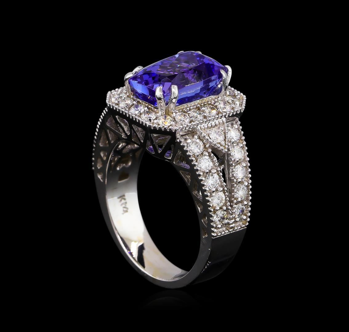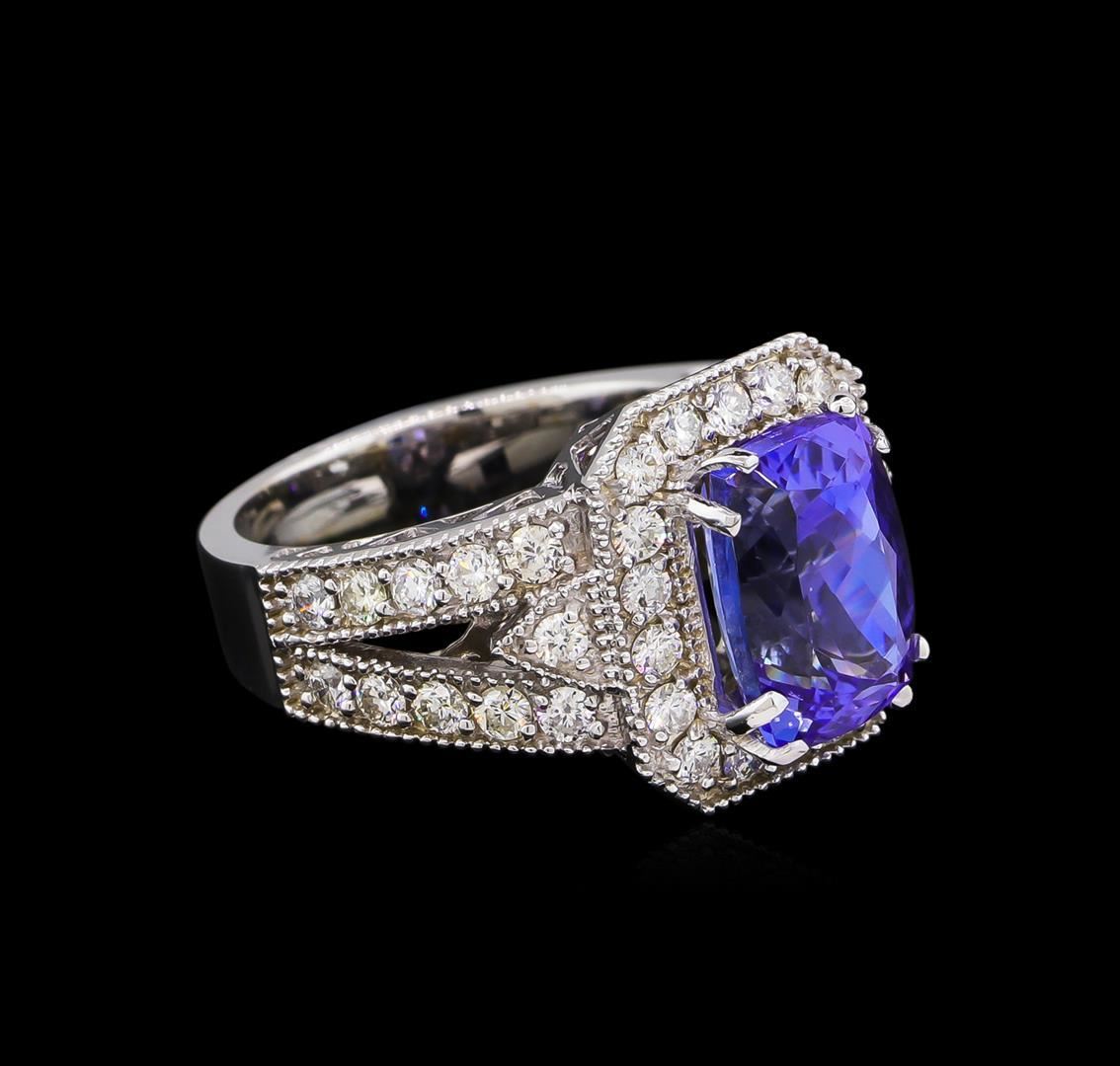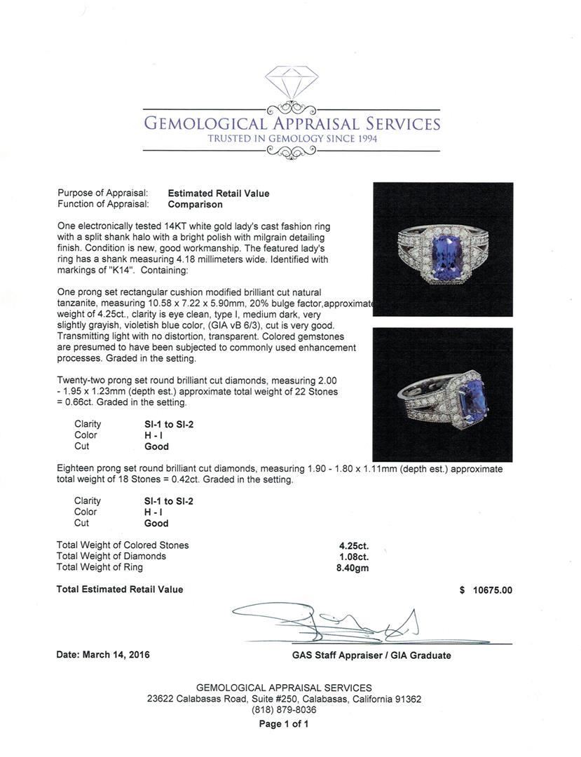 One electronically tested 14KT white gold lady's cast fashion ring with a split shank halo with a bright polish with milgrain detailing finish. The featured lady's ring has a shank measuring 4.18 millimeters wide. Identified with markings of "K14". Condition is new, good workmanship. Containing: One prong set rectangular cushion modified brilliant cut natural tanzanite, measuring 10.58 x 7.22 x 5.90mm, 20%. bulge factor, approximate weight of 4.25ct., clarity is eye clean, type I, medium dark, very slightly grayish, violetish blue color, (GIA vB 6/3), cut is very good. Transmitting light with no distortion, transparent. Colored gemstones are presumed to have been subjected to commonly used enhancement processes. Graded in the setting. Twenty-Two prong set round brilliant cut diamonds, measuring 2.00 - 1.95 x 1.23mm (depth est.) approximate total weight of 22 Stones = 0.66ct. Graded in the setting. Clarity: SI-1 to SI-2. Color: H - I. Cut Good Eighteen prong set round brilliant cut diamonds, measuring 1.90 - 1.80 x 1.11mm (depth est.) approximate total weight of 18 Stones = 0.42ct. Graded in the setting. Clarity: SI-1 to SI-2. Color: H - I. Cut Good. Total Weight of Colored Stones 4.25ct. Total Weight of Diamonds 1.08ct. Total Weight of Ring 8.40gm. GAS Appraised.