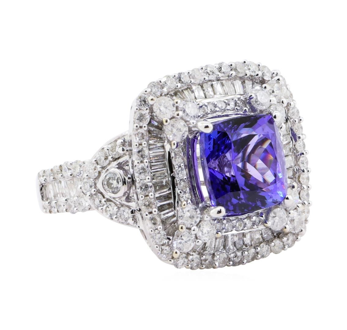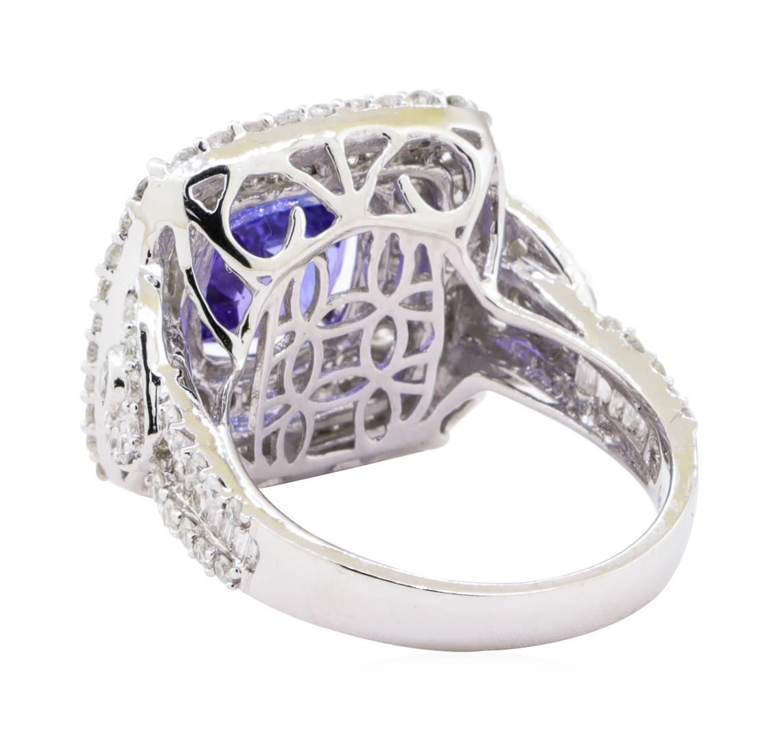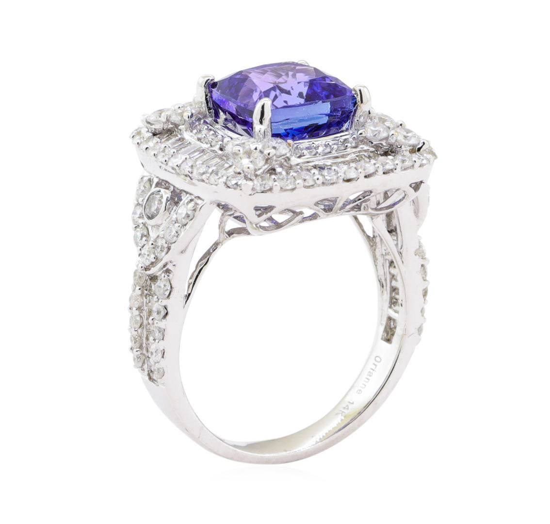 One electronically tested 14KT white gold ladies cast tanzanite & diamond ring. The featured tanzanite is set within a three tiered diamond bezel, supported by an elaborate lattice under gallery and diamond set shoulders, completed by a two and one half millimeter wide band. Bright polish finish. Trademark is Orianne. Identified with markings of "14K". Condition is new, good workmanship. Containing: One prong set square cushion cut natural tanzanite, measuring 8.75 x 8.60 x 7.00mm, approximate weight of 4.25ct., clarity is eye clean, type I, medium dark, moderately strong, violet color, (GIA V 6/4), cut is good. Transmitting light with a minimum of distortion, transparent. Naturally occurring internal & external characteristics are present. Graded in the setting. Tanzanite is a very rare gemstone that is only found in the country of Tanzania. Originally discovered in 1967. Tiffany & Company, named the stone Tanzanite. It is found in the Usumburu Mountains that border the Umba Valley of northern Tanzania. Tanzanite occurs in gray, brown, violet, blue, reddish-purple, & green. The gem is interesting because of its exceptional pleochroism. Rotated in different directions a tanzanite will exhibit multiple changes of color. Tanzanite has a low tolerance to ultrasonic cleaning, and should not be cleaned using this method. One Hundred Forty-Six prong & bezel set round & baguette cut diamonds approximate total weight of 146 Stones = 2.38ct. Graded in the setting. Clarity I-1 to I-2 Color F - H Total Weight of Colored Stones 4.25 ct. Total Weight of Diamonds 2.38 ct. Total Weight of Ring 8.70 gm Estimated Retail Value $ 17,250.00 US