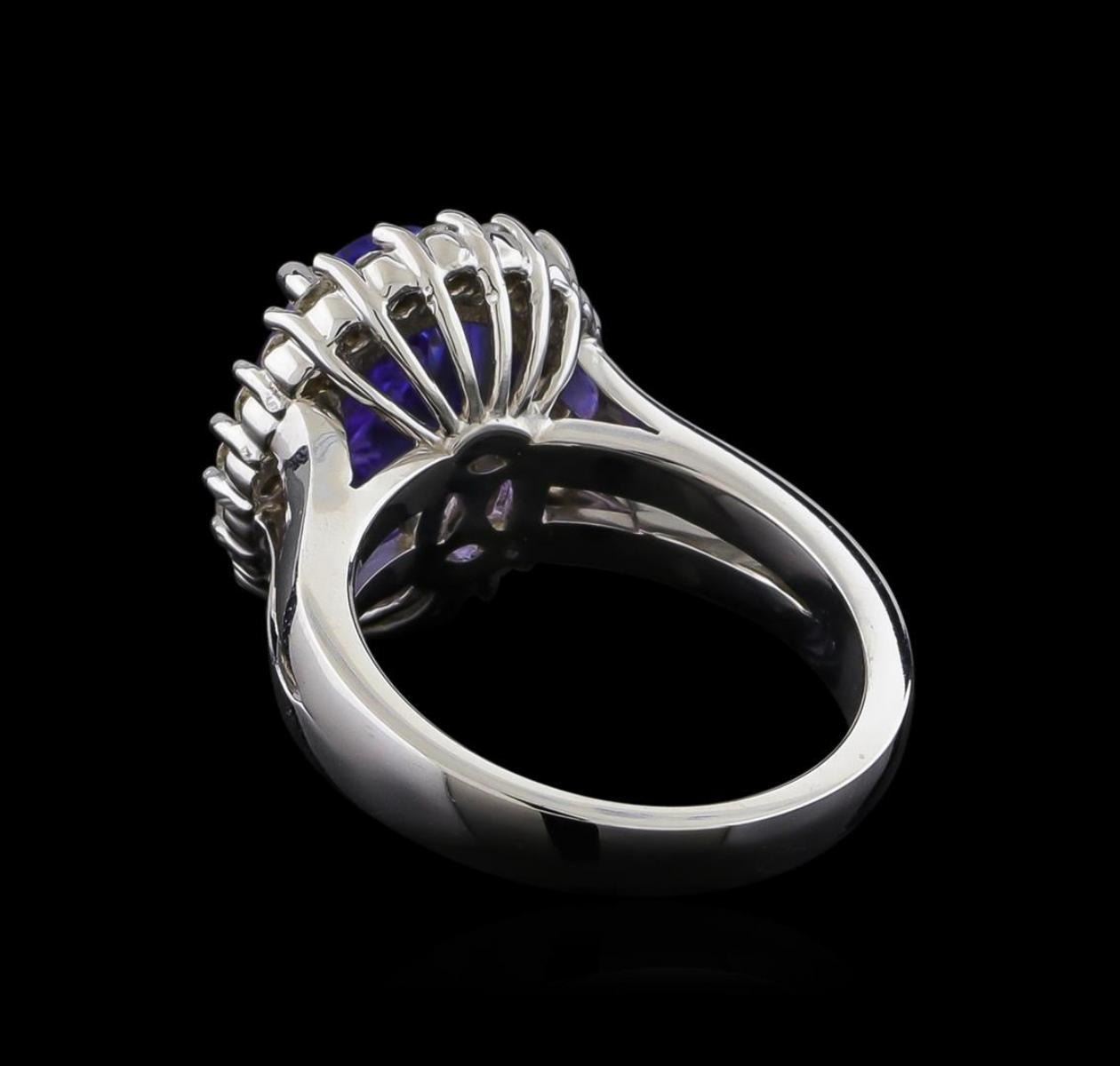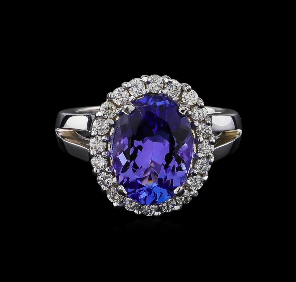 One electronically tested 14KT white gold lady's cast fashion ring with a basket halo with a bright polish finish. The featured lady's ring has a shank measuring 3.17 millimeters wide. Identified with markings of "14K". Condition is new, good workmanship. Containing: One prong set oval modified brilliant cut natural tanzanite, measuring 12.38 x 8.92 x 5.44mm, approximate weight of 4.25ct., clarity is eye clean, type I, medium light, moderately strong, violetish blue color, (GIA vB 4/4), cut is good. Transmitting light with no distortion, transparent. Colored gemstones are presumed to have been subjected to commonly used enhancement processes. Graded in the setting. Twenty prong set round brilliant cut diamonds, measuring 1.90 - 1.85 x 1.17mm (depth est.) approximate total weight of 20 Stones = 0.50ct. Graded in the setting. Clarity: SI-1 to SI-2. Color: G - Good. Total Weight of Colored Stones 4.25ct. Total Weight of Diamonds 0.50ct. Total Weight of Ring 9.30gm. GAS Appraised.