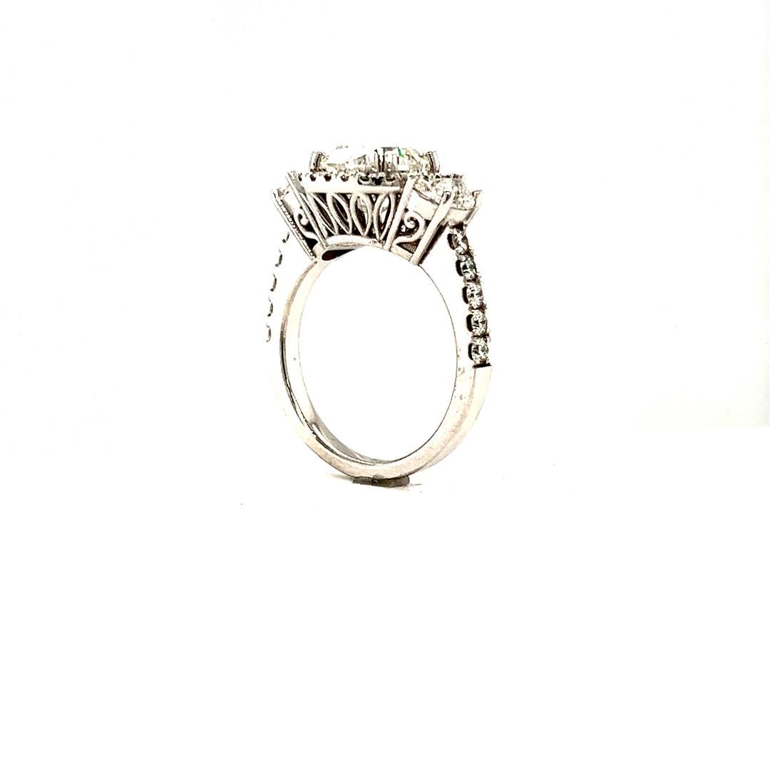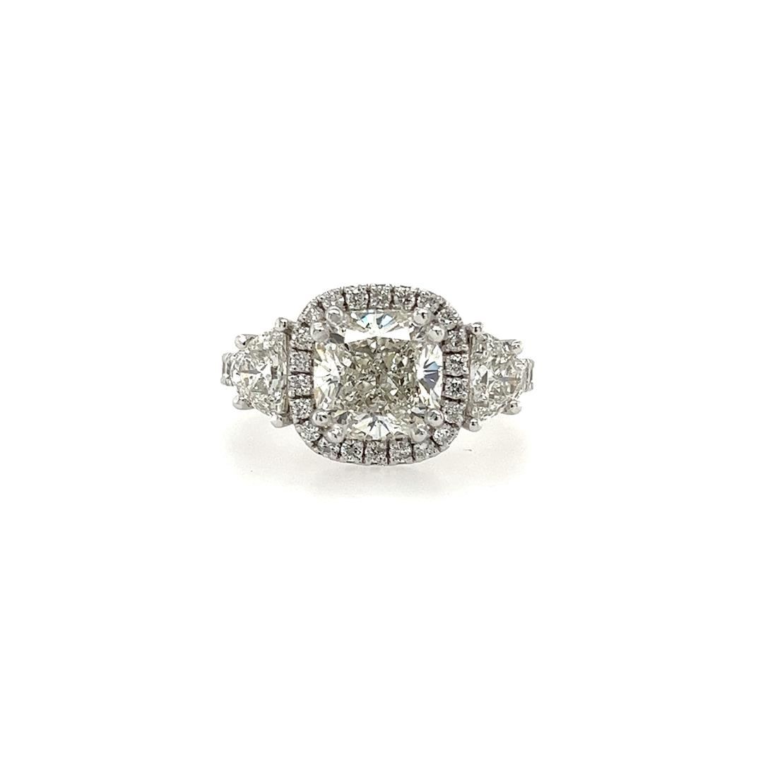 One electronically tested 14KT white gold lady's custom CAD/CAM fashion three stone ring with a cathedral basket halo with a bright polish finish. Condition is new, good workmanship. The featured lady's ring has a shank measuring 2.30 millimeters in width. Identified with markings of "14K". Containing: One prong set cushion cut diamond, measuring 7.94 x 7.81 x 5.55mm (depth est.), 5.00% GTCF approximate weight of 3.01ct. Clarity of VS-2, color of G, cut is excellent. EGL USA Laboratory Report # US 913531801D.. Two prong set half moon cut diamonds, measuring 6.00 x 3.80 x 0.00mm (depth est.) approximate total weight of 2 Stones = 0.72ct. Clarity of VS-1, color of F - G, cut is excellent. Graded in the setting. Ten prong set round brilliant cut diamonds, measuring 2.10 - 2.00 x 1.27mm (depth est.) approximate total weight of 10 Stones = 0.33ct. Clarity of VS-2 to SI-1, color of G - H, cut is ideal. Graded in the setting. Twenty-two prong set round brilliant cut diamonds, measuring 1.40 - 1.35 x 0.86mm (depth est.) approximate total weight of 22 Stones = 0.22ct. Clarity of VS-2 to SI-1, color of G - H, cut is very good. Graded in the setting. Total Weight of Diamonds 4.28ct. Total Weight of Ring 5.70gm Total Estimated Retail Value $ 125785.00