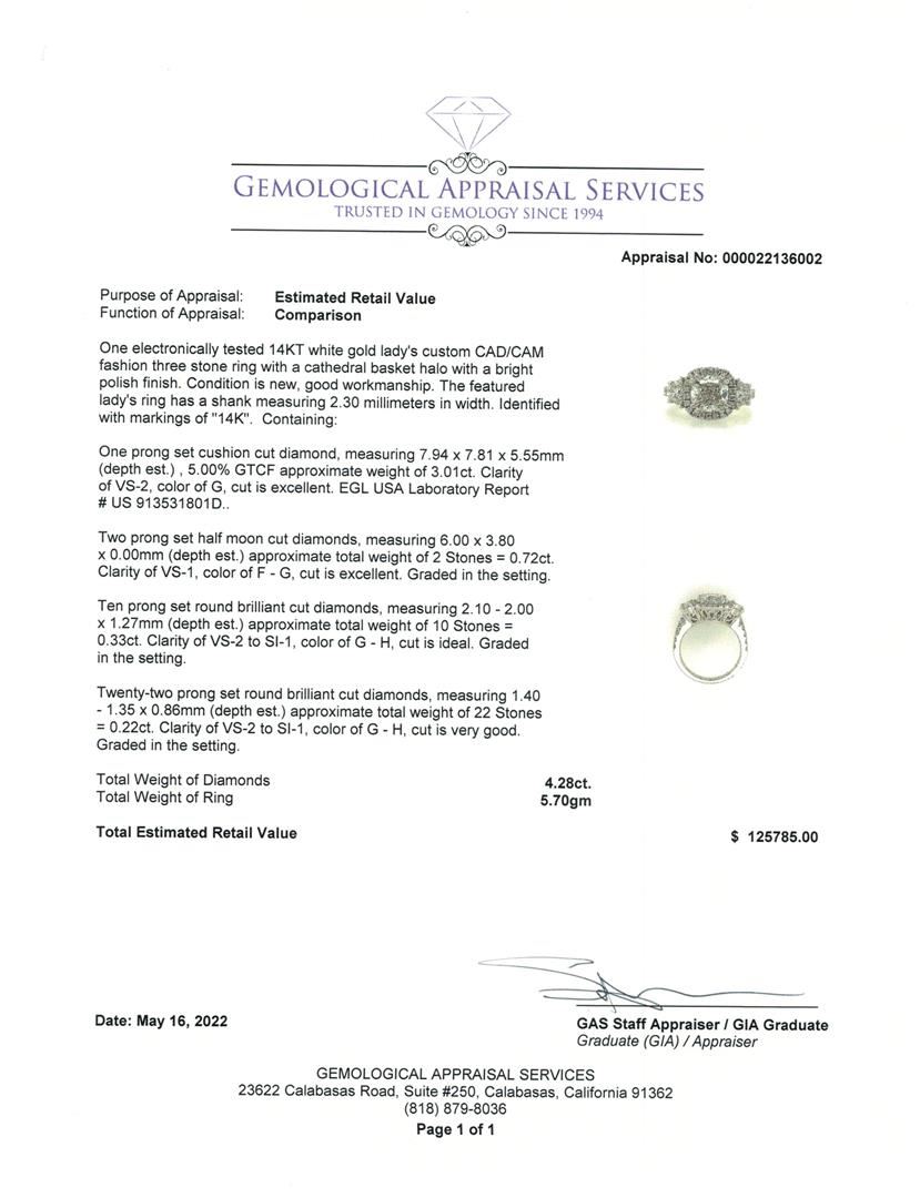 One electronically tested 14KT white gold lady's custom CAD/CAM fashion three stone ring with a cathedral basket halo with a bright polish finish. Condition is new, good workmanship. The featured lady's ring has a shank measuring 2.30 millimeters in width. Identified with markings of "14K". Containing: One prong set cushion cut diamond, measuring 7.94 x 7.81 x 5.55mm (depth est.), 5.00% GTCF approximate weight of 3.01ct. Clarity of VS-2, color of G, cut is excellent. EGL USA Laboratory Report # US 913531801D.. Two prong set half moon cut diamonds, measuring 6.00 x 3.80 x 0.00mm (depth est.) approximate total weight of 2 Stones = 0.72ct. Clarity of VS-1, color of F - G, cut is excellent. Graded in the setting. Ten prong set round brilliant cut diamonds, measuring 2.10 - 2.00 x 1.27mm (depth est.) approximate total weight of 10 Stones = 0.33ct. Clarity of VS-2 to SI-1, color of G - H, cut is ideal. Graded in the setting. Twenty-two prong set round brilliant cut diamonds, measuring 1.40 - 1.35 x 0.86mm (depth est.) approximate total weight of 22 Stones = 0.22ct. Clarity of VS-2 to SI-1, color of G - H, cut is very good. Graded in the setting. Total Weight of Diamonds 4.28ct. Total Weight of Ring 5.70gm Total Estimated Retail Value $ 125785.00