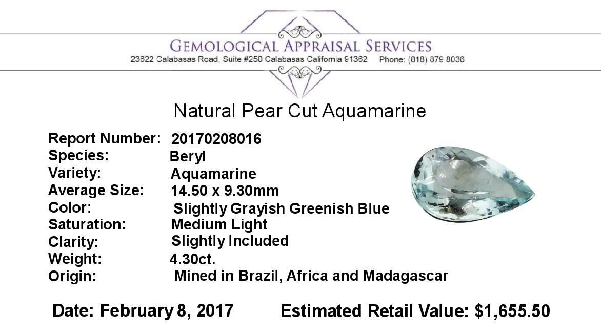 One natural pear cut aquamarine with an exact weight of 4.30ct., clarity is slightly included, slightly grayish greenish blue, medium light. Gemological Appraisals Services estimates the retail value at $1655.5 GAS Appraised.