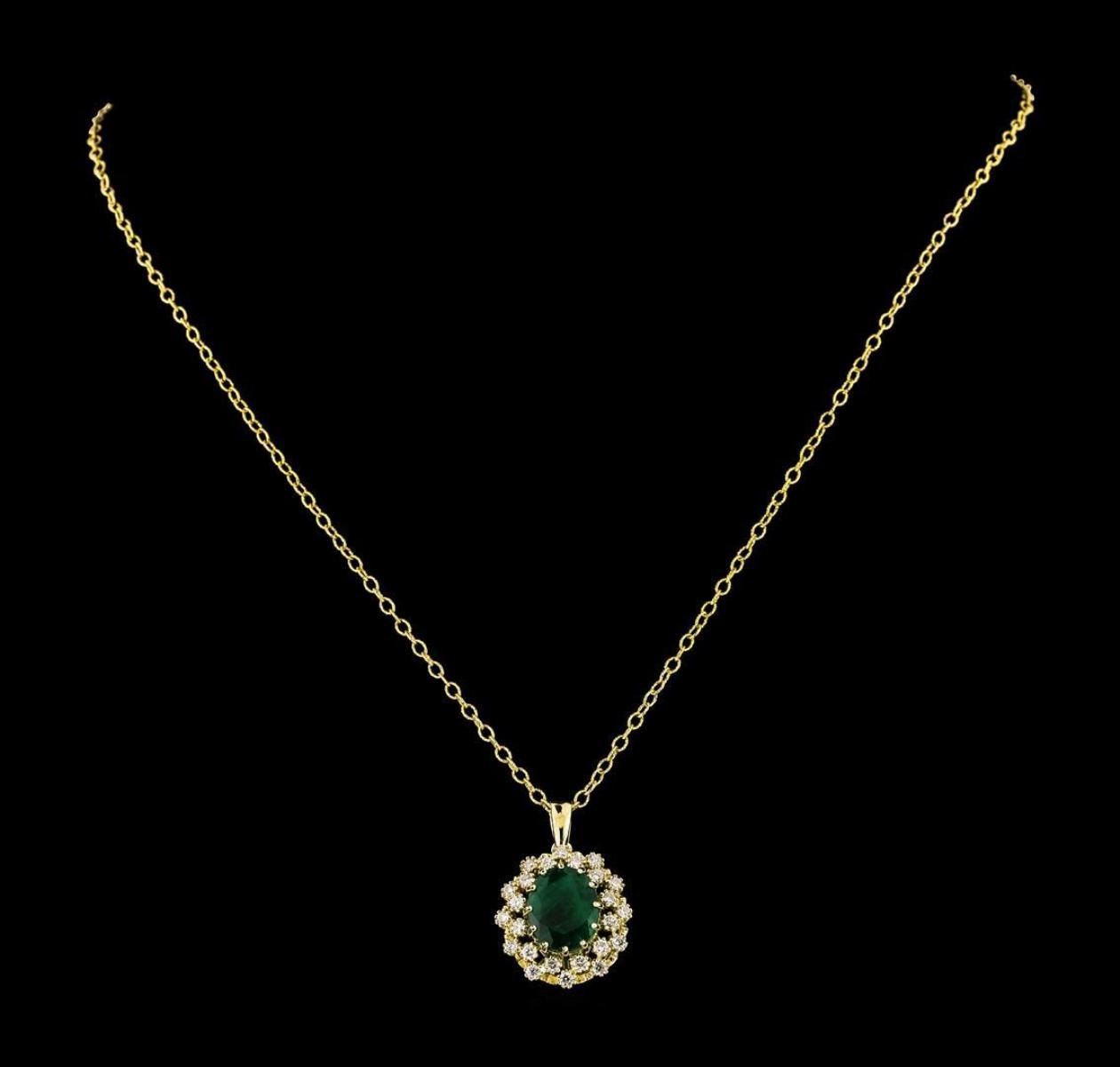 One electronically tested 14KT yellow gold lady's combination cast & assembled fashion pendant & chain 18.0' long, 1.9mm twisted oval shape link with a lobster claw clasp with a double basket halo with a bright polish finish. Identified with markings of '14K'. Condition is new, good workmanship. Containing: One prong set oval modified mixed cut natural emerald, measuring 11.55 x 9.10 x 6.28mm, (depth est.) 15%. bulge factor, approximate weight of 4.30 ct., clarity is heavily included, medium dark, moderately strong, green color, (GIA G 6/4), cut is good. Transmitting light somewhat diffusely, semi-transparent to translucent. Naturally occurring internal & external characteristics are present. Indications of oil residue. Colored gemstones are presumed to have been subjected to commonly used enhancement processes. Graded in the setting. Twenty-Four prong set round brilliant cut diamonds, measuring 1.90 - 1.85 x 1.17mm (depth est.) approximate total weight of 24 Stones = 0.60 ct. Graded in the setting. Clarity VS-2 to SI-1. Color: G - H Cut Good. Total Weight of Colored Stones 4.30 ct.. Total Weight of Diamonds 0.60 ct.. Total Weight of Pendant & Chain 7.10gm. GAS Appraised.