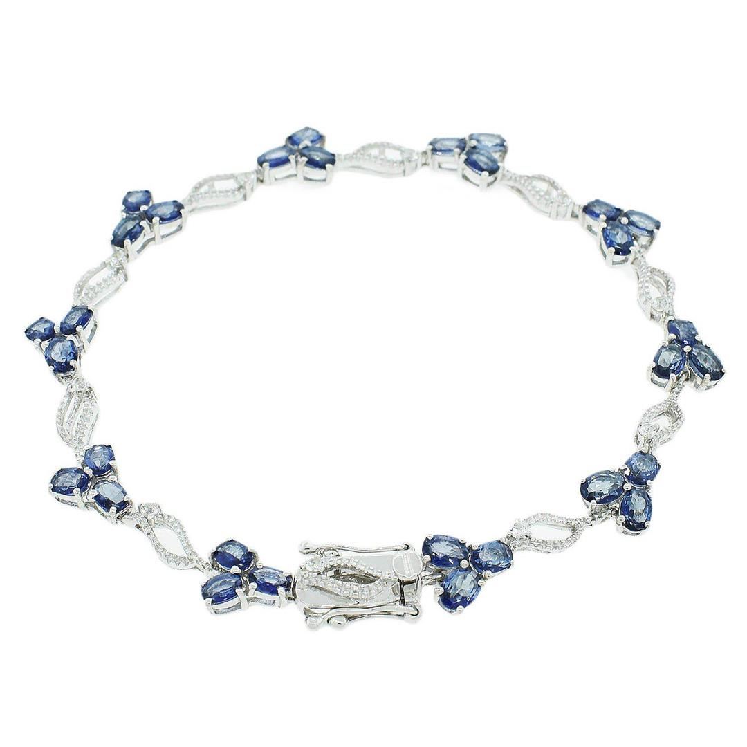 Electronically tested 925 silver ladies cast & assembled tanzanite and white topaz bracelet. Seven inch length bracelet features a flexible tanzanite trio and white topaz accented ribbon, terminating in a concealed clasp with twin safeties. Bright polish finish with milgrain detailing. Trademark is Orianne. Identified with markings of "925". Condition is new, good workmanship. Thirty prong set oval mixed cut natural tanzanites approximate total weight of 4.30ct., clarity is eye clean, type I, medium dark, very slightly grayish, violetish blue color, (GIA vB 6/3), cut is good. Transmitting light with no distortion, transparent. Color grade is an average for the group. Graded in the setting.Natural Tanzanite, color enhanced due to cobalt coating. The presence of the coating prevents determining the stone's actual depth of color. Transmitting light with no distortion, transparent. Grading in the setting. The cobalt coated Tanzanite has a low tolerance to ultrasonic cleaning, and should not be cleaned using this method. Tanzanite is a very rare gemstone that is only found in the country of Tanzania. Originally discovered in 1967. Tiffany & Company, named the stone Tanzanite. It is found in the Usumburu Mountains that border the Umba Valley of northern Tanzania. Tanzanite occurs in gray, brown, violet, blue, reddish-purple, & green. The gem is interesting because of its exceptional pleochroism. Rotated in different directions a tanzanite will exhibit multiple changes of color. Ten prong set round mixed cut natural white topazs approximate total weight of 0.23ct., clarity is eye clean, colorless, very slightly grayish, white color, (GIA W 0/3), cut is good. Transmitting light with no distortion, transparent. Color grade is an average for the group. Graded in the setting. (SKU#40178)