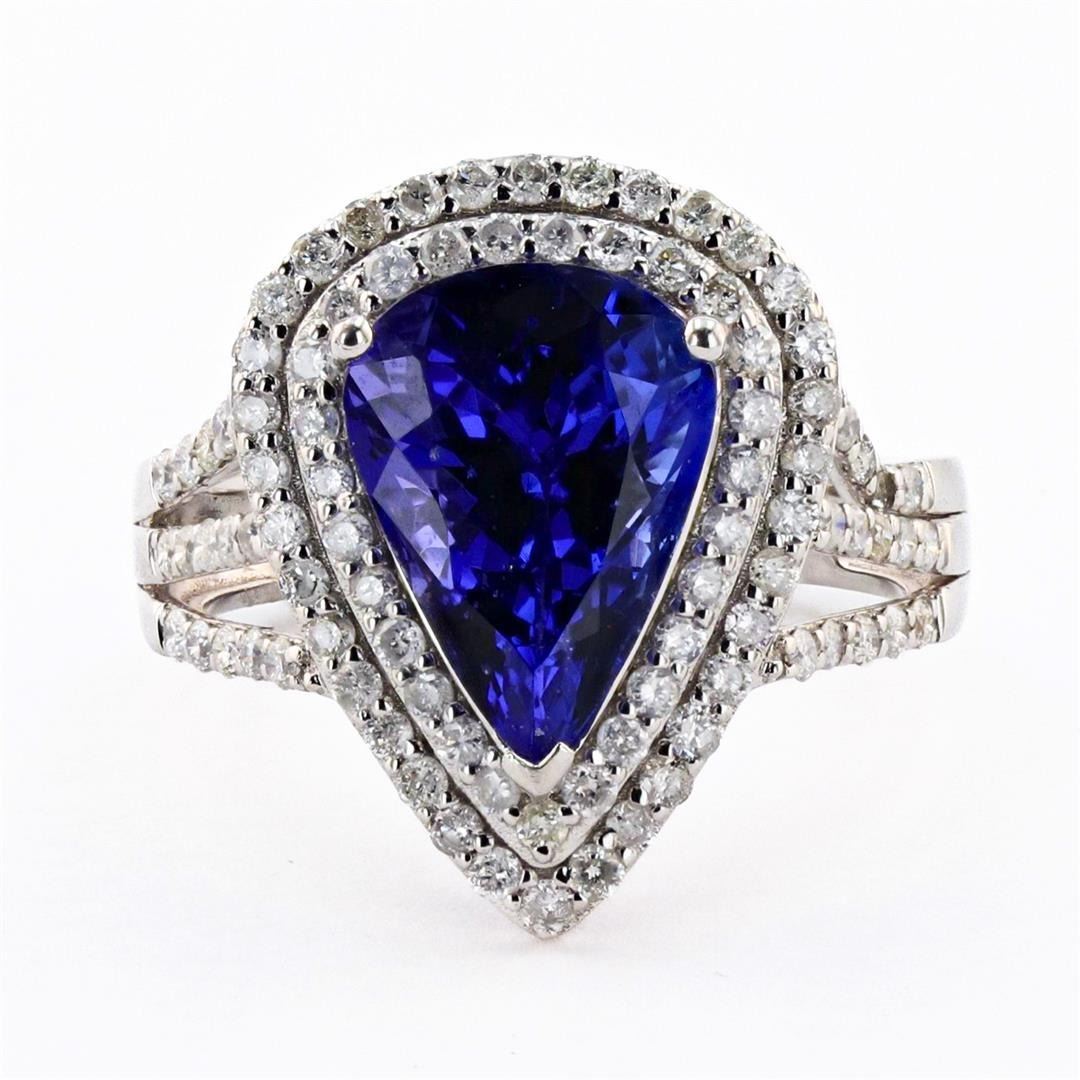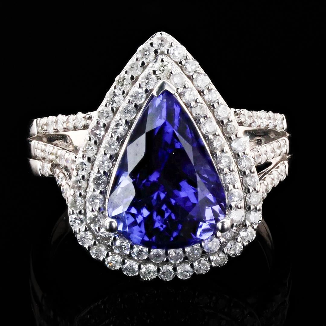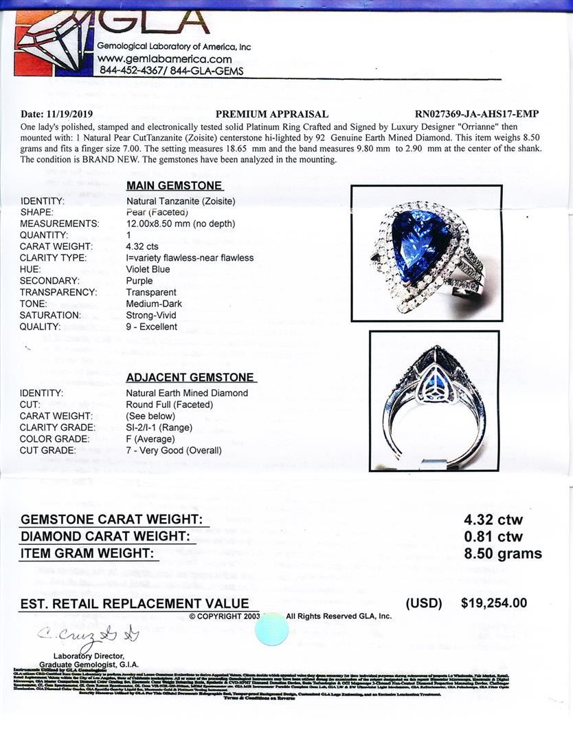 4.32ct Tanzanite and 0.81ctw Diamond Platinum Ring. One lady's polished, stamped and electronically tested solid Platinum Ring Crafted and Signed by Luxury Designer "Orrianne" then mounted with: 1 Natural Pear CutTanzanite (Zoisite) centers tone hi-lighted by 92 Genuine Earth Mined Diamond. This item weighs 8.50 grates and fits a finger size 7.00. The setting measures 18.65 mm and the band measures 9.80 mm to 2.90 mm at the center of the shank. The condition is BRAND NEW. The gemstones have been analyzed in the mounting. MAIN GEMSTONE IDENTITY: Natural Tanzanite (Zoisite) SHAPE: Pear (Faceted) MEASUREMENTS: 12.00x8.50mm (no depth) QUANTITY: 1 CARAT WEIGHT: 4.32 cts CLARITY TYPE: 1=variety flawless-near flawless HUE: Violet Blue SECONDARY: Purple TRANSPARENCY: Transparent TONE: Medium-Dark SATURATION: Strong-Vivid QUALITY: 9 - Excellent ADJACENT GEMSTONE IDENTITY: Natural Earth Mined Diamond CUT: Round Full (Faceted) CARAT WEIGHT: 0.81 ctw CLARITY GRADE: SI-2/I-1 (Range) COLOR GRADE: F (Average) CUT GRADE: 7 - Very Good (Overall) GEMSTONE CARAT WEIGHT: 4.32 ctw DIAMOND CARAT WEIGHT: 0.81 ctw ITEM GRAM WEIGHT: 8.50 grams