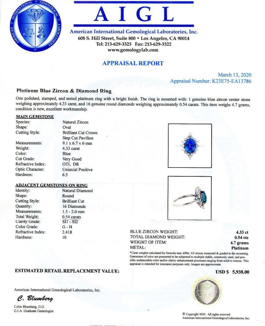 One polished, stamped, and tested platinum ring with a bright finish. The ring is mounted with: 1 genuine blue zircon center stone weighing approximately 4.33 carat, and 16 genuine round diamonds weighing approximately 0.54 carats. This item weighs 4.7 grams, condition is new, excellent workmanship. MAIN GEMSTONE Species: Natural Zircon Shape: Oval Cutting Style: Brilliant Cut Crown Step Cut Pavilion Measurements: 9.1 x 6.7 x 6mm Weight: 4.33 carat Color: Blue Cut Grade: Very Good Refractive Index: OTL DR Optic Character: Uniaxial Positive Hardness: 6.5 ADJACENT GEMSTONES ON RING Identity: Natural Diamond Shape: Round Cutting Style: Brilliant Cut Quantity: 16 Diamonds Measurements: 1.5 - 2.0mm Total Weight: 0.54 carats Clarity Grade: SI1 to SI2 Color Grade: G - H Refractive Index: 2.418 Hardness: 10 BLUE ZIRCON WEIGHT: 4.33ct TOTAL DIAMOND WEIGHT: 0.54ctw WEIGHT OF ITEM: 4.7 grams METAL: Platinum