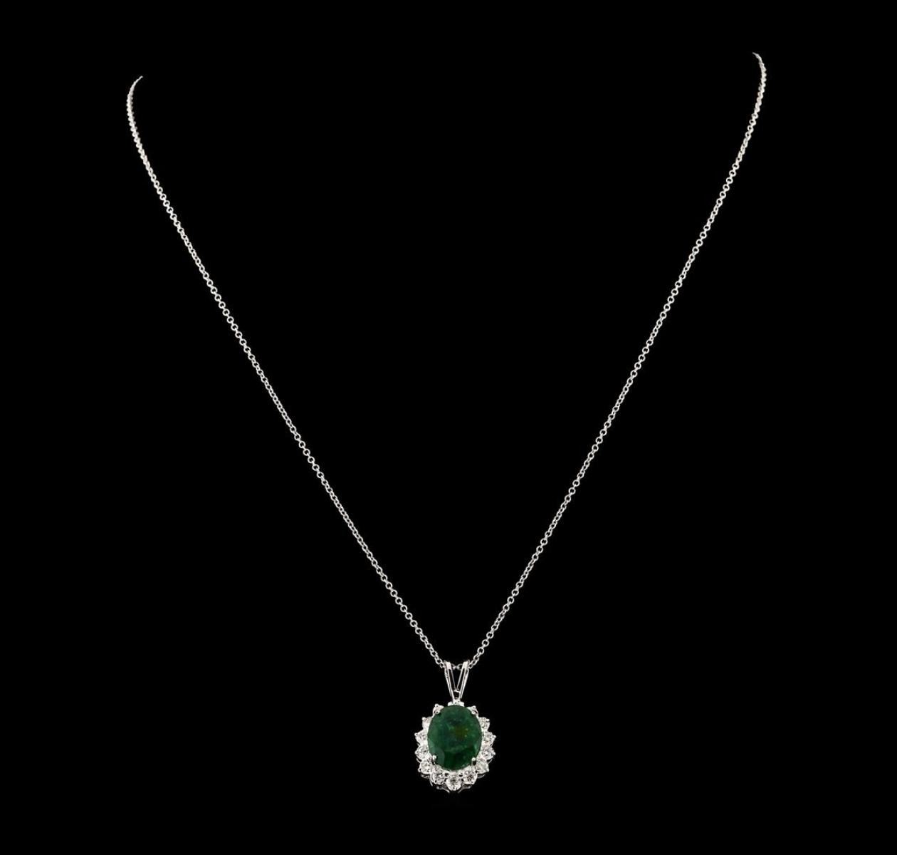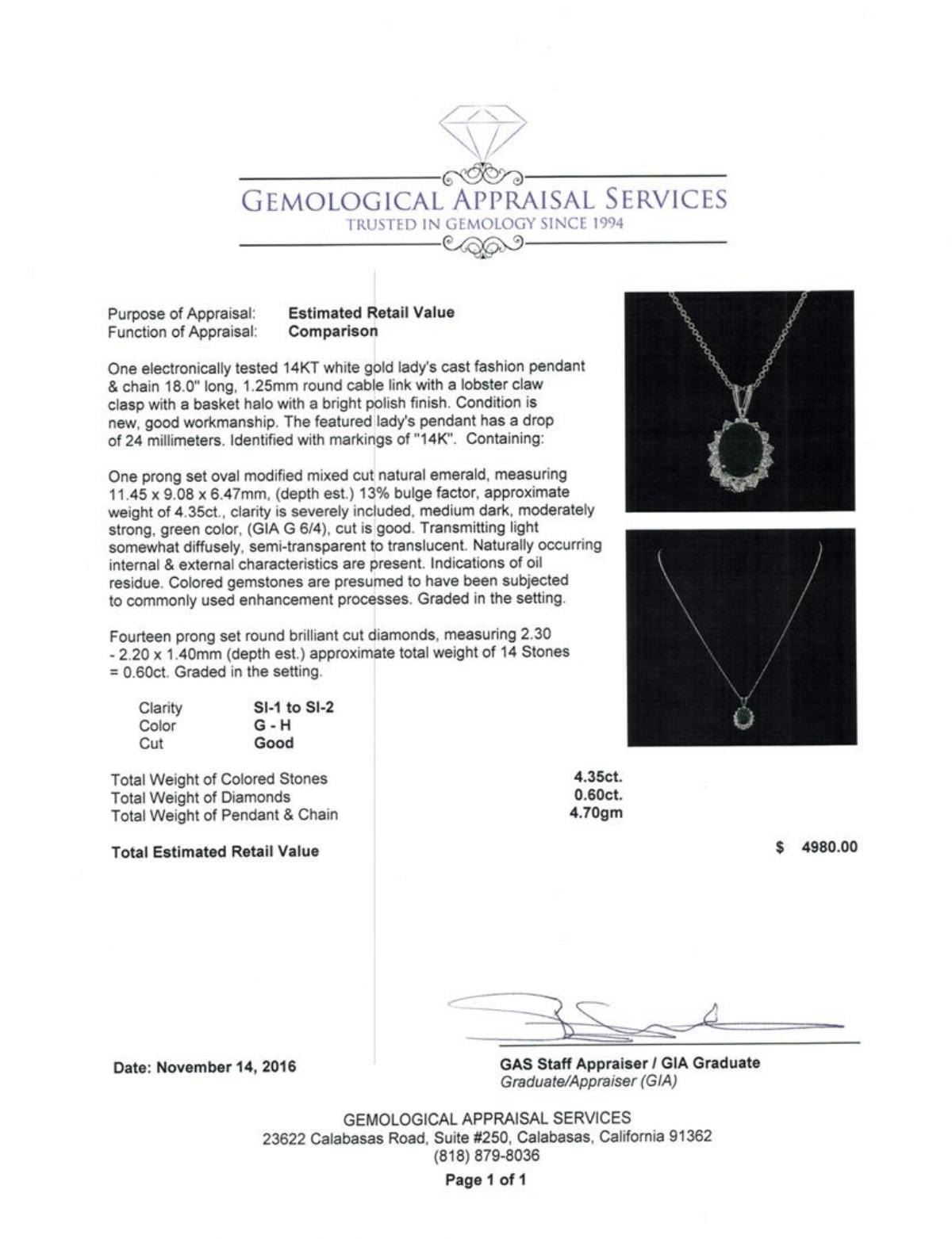 One electronically tested 14KT white gold lady's cast fashion pendant & chain 18.0' long, 1.25mm round cable link with a lobster claw clasp with a basket halo with a bright polish finish. The featured lady's pendant has a drop of 24 millimeters. Identified with markings of '14K'. Condition is new, good workmanship. Containing: One prong set oval modified mixed cut natural emerald, measuring 11.45 x 9.08 x 6.47mm, (depth est.) 13%. bulge factor, approximate weight of 4.35ct., clarity is severely included, medium dark, moderately strong, green color, (GIA G 6/4), cut is good. Transmitting light somewhat diffusely, semi-transparent to translucent. Naturally occurring internal & external characteristics are present. Indications of oil residue. Colored gemstones are presumed to have been subjected to commonly used enhancement processes. Graded in the setting. Fourteen prong set round brilliant cut diamonds, measuring 2.30 - 2.20 x 1.40mm (depth est.) approximate total weight of 14 Stones = 0.60ct. Graded in the setting. Clarity SI-1 to SI-2. Color: G - H Cut Good. Total Weight of Colored Stones 4.35ct.. Total Weight of Diamonds 0.60ct.. Total Weight of Pendant & Chain 4.70gm GAS Appraised.