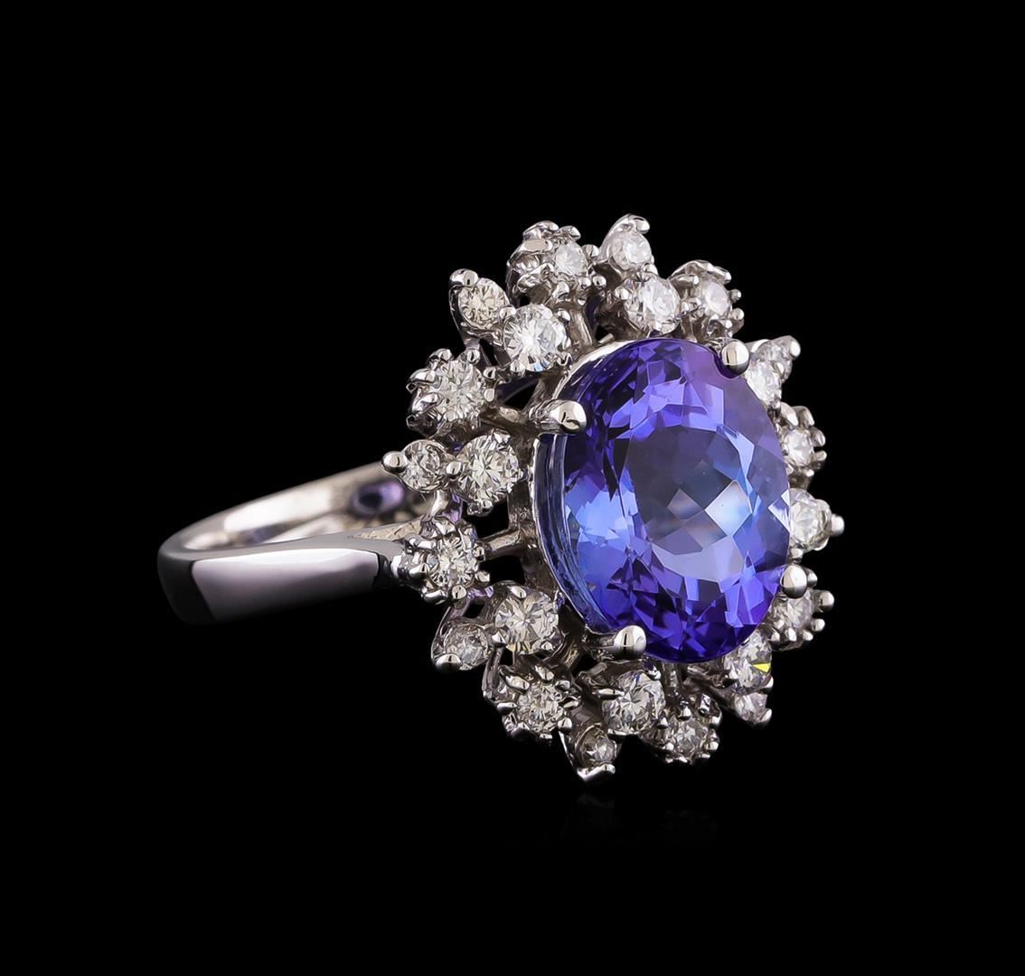 One electronically tested 14KT white gold lady's cast fashion ring with a basket double halo with a bright polish finish. The featured lady's ring has a shank measuring 2.69 millimeters wide. Identified with markings of "K14". Condition is new, good workmanship. Containing: One prong set oval modified brilliant cut natural tanzanite, measuring 11.10 x 9.00 x 6.15mm, (depth est.) approximate weight of 4.35ct., clarity is eye clean, medium light, moderately strong, violetish blue color, (GIA vB 4/4), cut is very good. Transmitting light with no distortion, transparent. Colored gemstones are presumed to have been subjected to commonly used enhancement processes. Graded in the setting. Eight prong set round brilliant cut diamonds, measuring 2.30 - 2.20 x 1.40mm (depth est.) approximate total weight of 8 Stones = 0.36ct. Graded in the setting. Clarity: SI-1 to SI-2. Color: H - I. Cut Good Eight prong set round brilliant cut diamonds, measuring 1.90 - 1.80 x 1.11mm (depth est.) approximate total weight of 8 Stones = 0.18ct. Graded in the setting. Clarity: SI-1 to SI-2. Color: H - I. Cut Good Eight round brilliant cut diamonds, measuring 1.60 - 1.50 x 0.93mm (depth est.) approximate total weight of 8 Stones = 0.11ct. Graded in the setting. Clarity: SI-1 to SI-2. Color: H - I. Cut Good. Total Weight of Colored Stones 4.35ct. Total Weight of Diamonds 0.65ct. Total Weight of Ring 5.70gm.