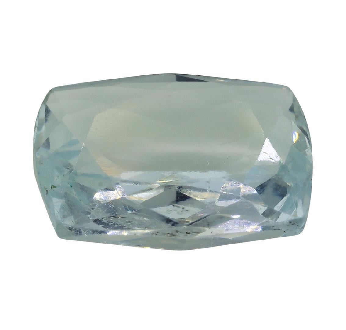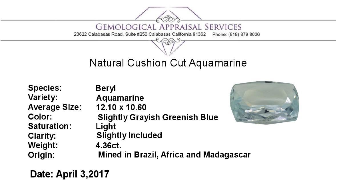 One natural cushion cut aquamarine with an exact weight of 4.36ct., clarity is slightly included, slightly grayish greenish blue, light. Gemological Appraisals Services estimates the retail value at $1090 GAS Appraised.