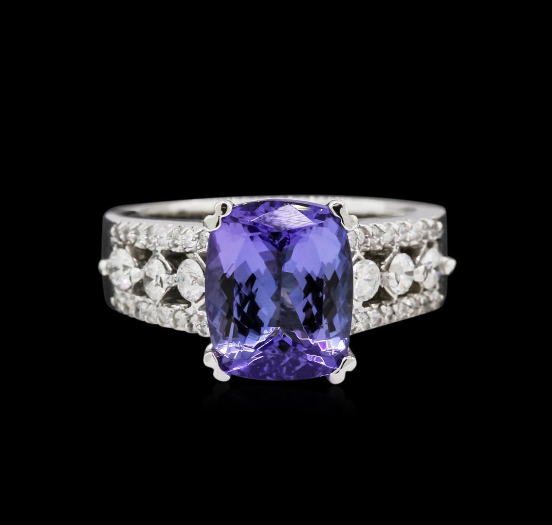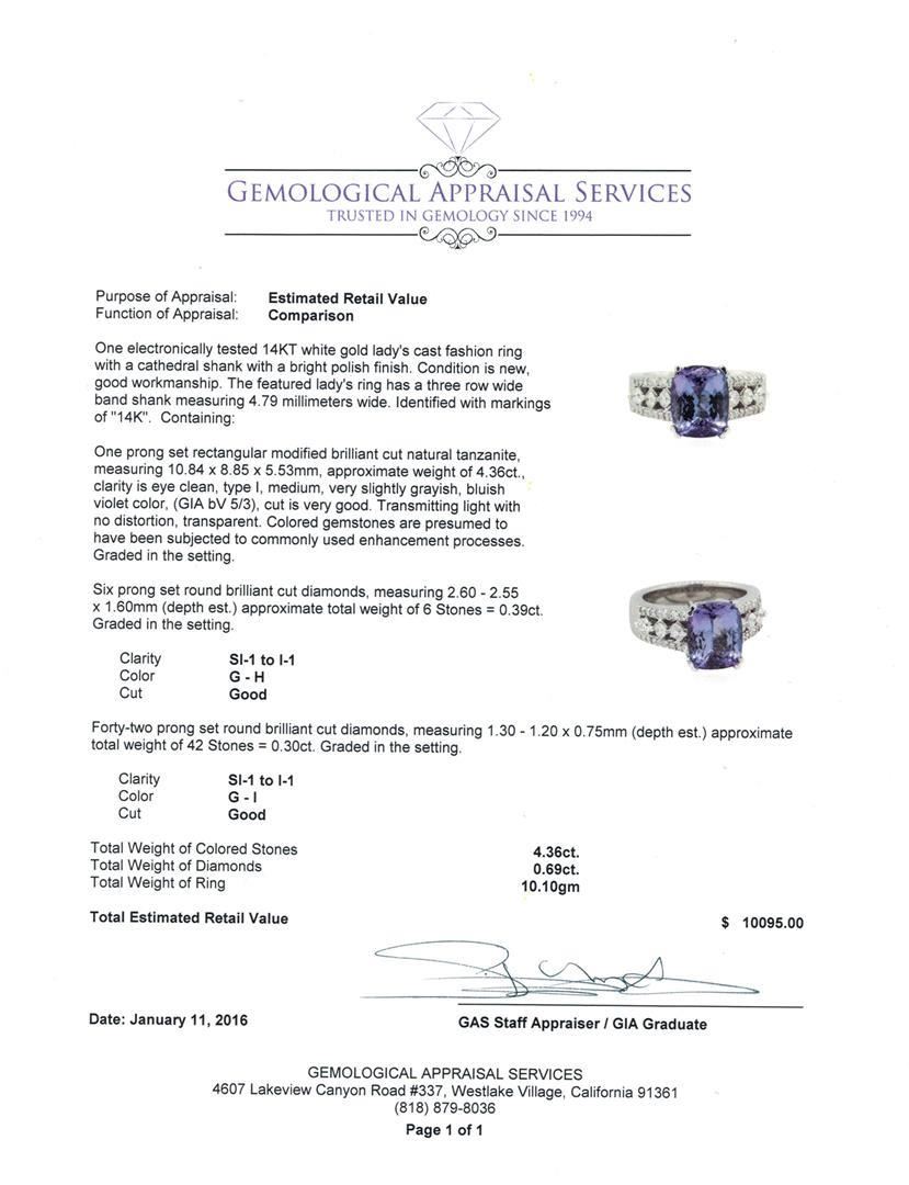 One electronically tested 14KT white gold lady's cast fashion ring with a cathedral shank with a bright polish finish. The featured lady's ring has a three row wide band shank measuring 4.79 millimeters wide. Identified with markings of "14K". Condition is new, good workmanship. Containing: One prong set rectangular modified brilliant cut natural tanzanite, measuring 10.84 x 8.85 x 5.53mm, approximate weight of 4.36ct., clarity is eye clean, type I, medium, very slightly grayish, bluish violet color, (GIA bV 5/3), cut is very good. Transmitting light with no distortion, transparent. Colored gemstones are presumed to have been subjected to commonly used enhancement processes. Graded in the setting. Six prong set round brilliant cut diamonds, measuring 2.60 - 2.55 x 1.60mm (depth est.) approximate total weight of 6 Stones = 0.39ct. Graded in the setting. Clarity: SI-1 to I-1. Color: G - Good Forty-Two prong set round brilliant cut diamonds, measuring 1.30 - 1.20 x 0.75mm (depth est.) approximate total weight of 42 Stones = 0.30ct. Graded in the setting. Clarity: SI-1 to I-1. Color: G - I. Cut Good. Total Weight of Colored Stones 4.36ct. Total Weight of Diamonds 0.69ct. Total Weight of Ring 10.10gm. GAS Appraised.