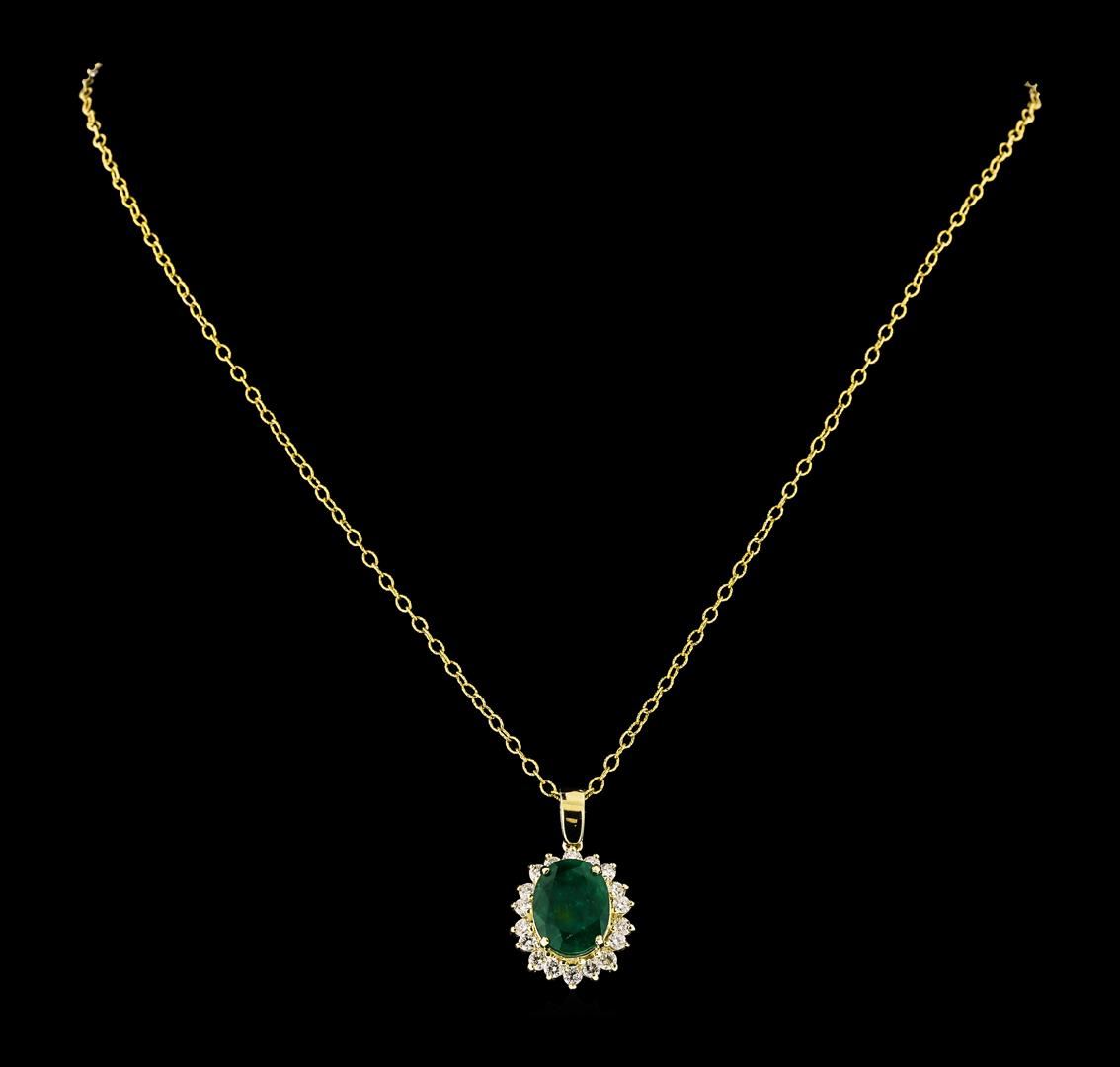 One electronically tested 14KT yellow gold lady's combination cast & assembled fashion pendant & chain 18.0' long, 1.9mm twisted oval shape link with a lobster claw clasp with a staggered basket halo with a bright polish finish. Identified with markings of '14K'. Condition is new, good workmanship. Containing: One prong set oval modified mixed cut natural emerald, measuring 12.92 x 9.61 x 5.30mm, (depth est.) 15%. bulge factor, approximate weight of 4.38ct., clarity is heavily included, medium dark, moderately strong, green color, (GIA G 6/4), cut is good. Transmitting light somewhat diffusely, semi-transparent to translucent. Naturally occurring internal & external characteristics are present. Indications of oil residue. Colored gemstones are presumed to have been subjected to commonly used enhancement processes. Graded in the setting. Eighteen prong set round brilliant cut diamonds, measuring 2.40 - 2.30 x 1.46mm (depth est.) approximate total weight of 18 Stones = 0.88ct. Graded in the setting. Clarity SI-1 to SI-2. Color: G - H Cut Good. Total Weight of Colored Stones 4.38ct.. Total Weight of Diamonds 0.88ct.. Total Weight of Pendant & Chain 6.90gm. GAS Appraised at $7,680.00.