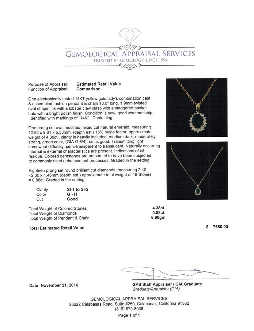 One electronically tested 14KT yellow gold lady's combination cast & assembled fashion pendant & chain 18.0' long, 1.9mm twisted oval shape link with a lobster claw clasp with a staggered basket halo with a bright polish finish. Identified with markings of '14K'. Condition is new, good workmanship. Containing: One prong set oval modified mixed cut natural emerald, measuring 12.92 x 9.61 x 5.30mm, (depth est.) 15%. bulge factor, approximate weight of 4.38ct., clarity is heavily included, medium dark, moderately strong, green color, (GIA G 6/4), cut is good. Transmitting light somewhat diffusely, semi-transparent to translucent. Naturally occurring internal & external characteristics are present. Indications of oil residue. Colored gemstones are presumed to have been subjected to commonly used enhancement processes. Graded in the setting. Eighteen prong set round brilliant cut diamonds, measuring 2.40 - 2.30 x 1.46mm (depth est.) approximate total weight of 18 Stones = 0.88ct. Graded in the setting. Clarity SI-1 to SI-2. Color: G - H Cut Good. Total Weight of Colored Stones 4.38ct.. Total Weight of Diamonds 0.88ct.. Total Weight of Pendant & Chain 6.90gm. GAS Appraised.