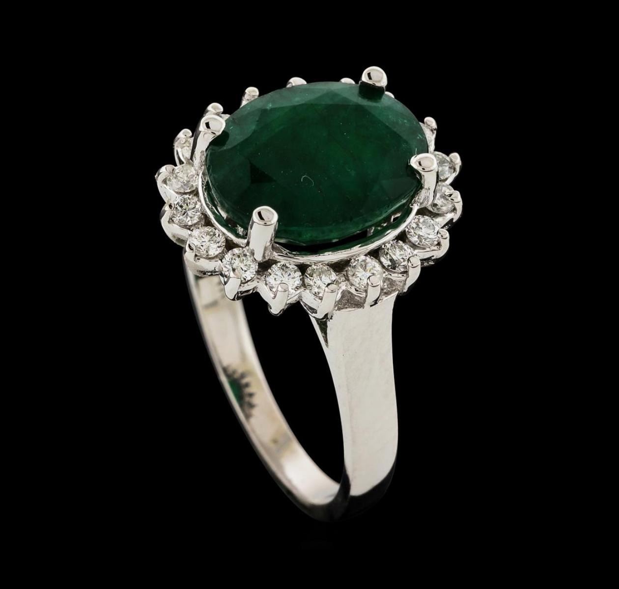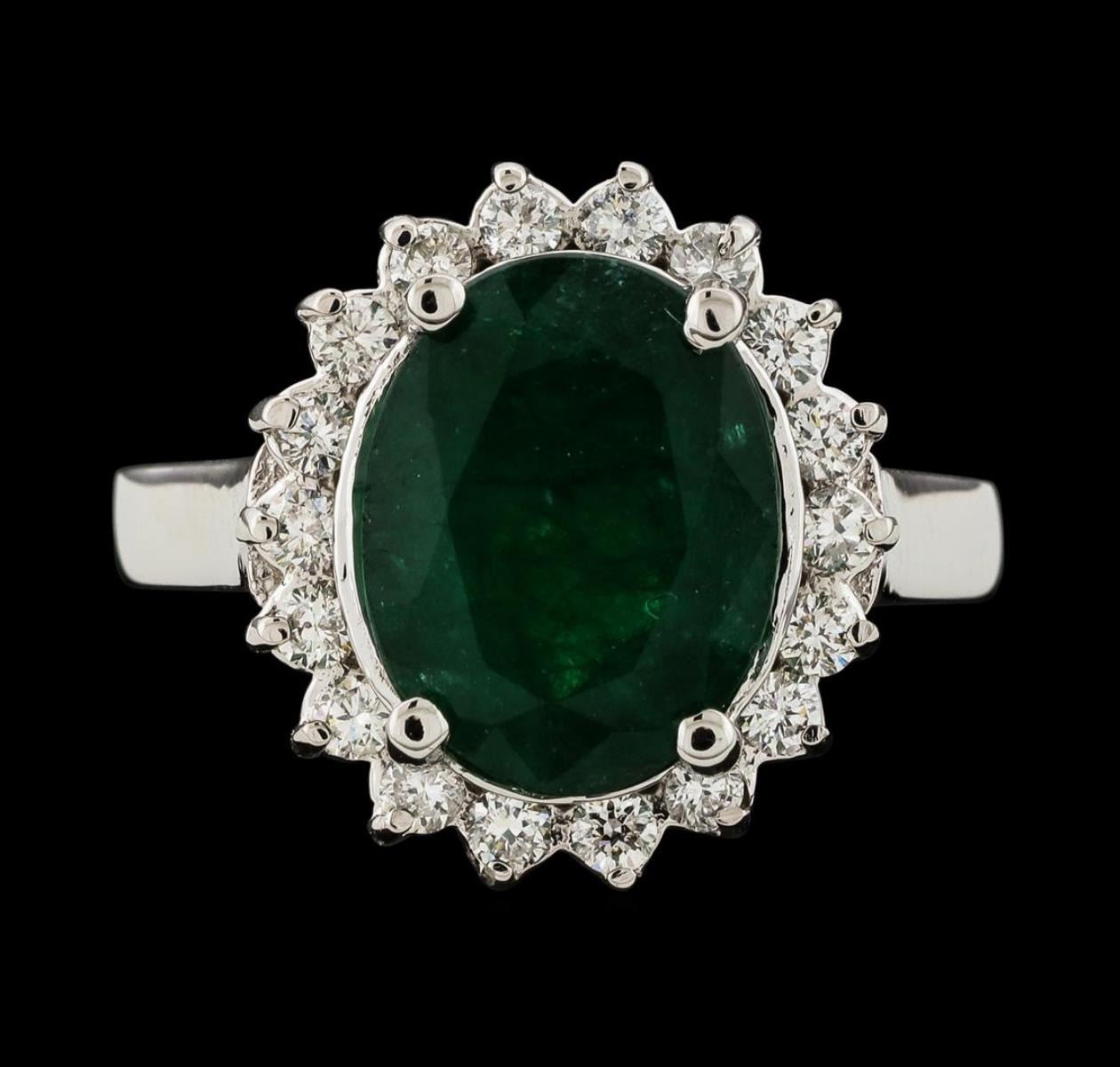 One electronically tested 14KT white gold lady's cast fashion ring with a basket halo with a bright polish finish. The featured lady's ring has a shank measuring 2.14 millimeters wide. Identified with markings of '14K'. Condition is new, good workmanship. Containing: One prong set oval modified mixed cut natural emerald, measuring 11.75 x 9.00 x 6.38mm, (depth est.) 13%. bulge factor, approximate weight of 4.38ct., clarity is heavily included, medium dark, moderately strong, green color, (GIA G 6/4), cut is good. Transmitting light somewhat diffusely, semi-transparent to translucent. Naturally occurring internal & external characteristics are present. Indications of oil residue. Colored gemstones are presumed to have been subjected to commonly used enhancement processes. Graded in the setting. Eighteen prong set round brilliant cut diamonds, measuring 2.00 - 1.90 x 1.17mm (depth est.) approximate total weight of 18 Stones = 0.48ct. Graded in the setting. Clarity VS-2 to SI-1. Color: H - I Cut Good. Total Weight of Colored Stones 4.38ct.. Total Weight of Diamonds 0.48ct.. Total Weight of Ring 5.40gm GAS Appraised.