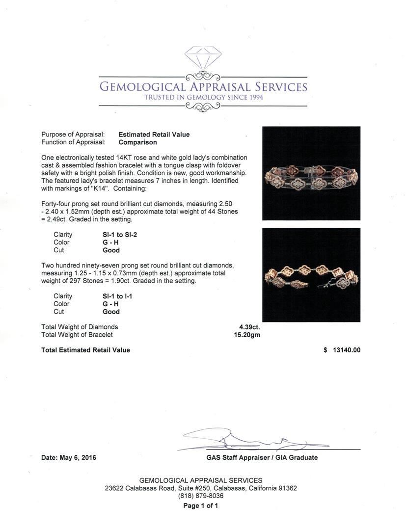 One electronically tested 14KT rose and white gold lady's combination cast & assembled fashion bracelet with a tongue clasp with foldover safety with a bright polish finish. The featured lady's bracelet measures 7 inches in length. Identified with markings of "K14". Condition is new, good workmanship. Containing: Forty-Four prong set round brilliant cut diamonds, measuring 2.50 - 2.40 x 1.52mm (depth est.) approximate total weight of 44 Stones = 2.49ct. Graded in the setting. Clarity: SI-1 to SI-2. Color: G - H. Cut Good Two Hundred Ninety-Seven prong set round brilliant cut diamonds, measuring 1.25 - 1.15 x 0.73mm (depth est.) approximate total weight of 297 Stones = 1.90 ct. Graded in the setting. Clarity: SI-1 to I-1. Color: G - Good. Total Weight of Diamonds 4.39ct. Total Weight of Bracelet 15.20gm GAS Appraised.