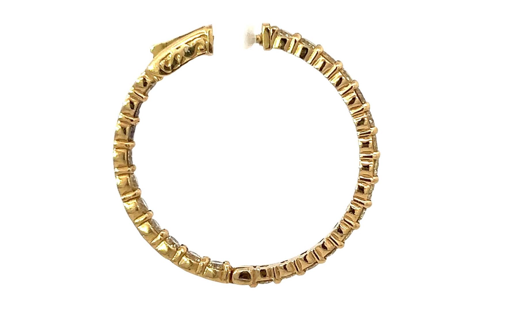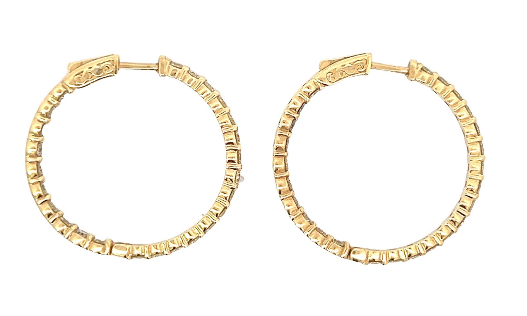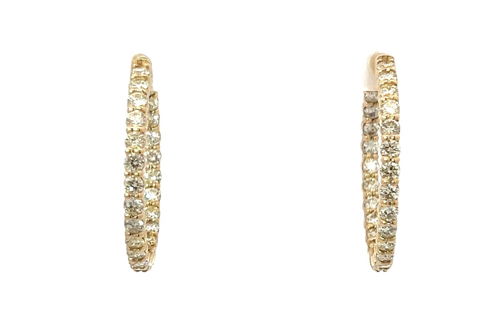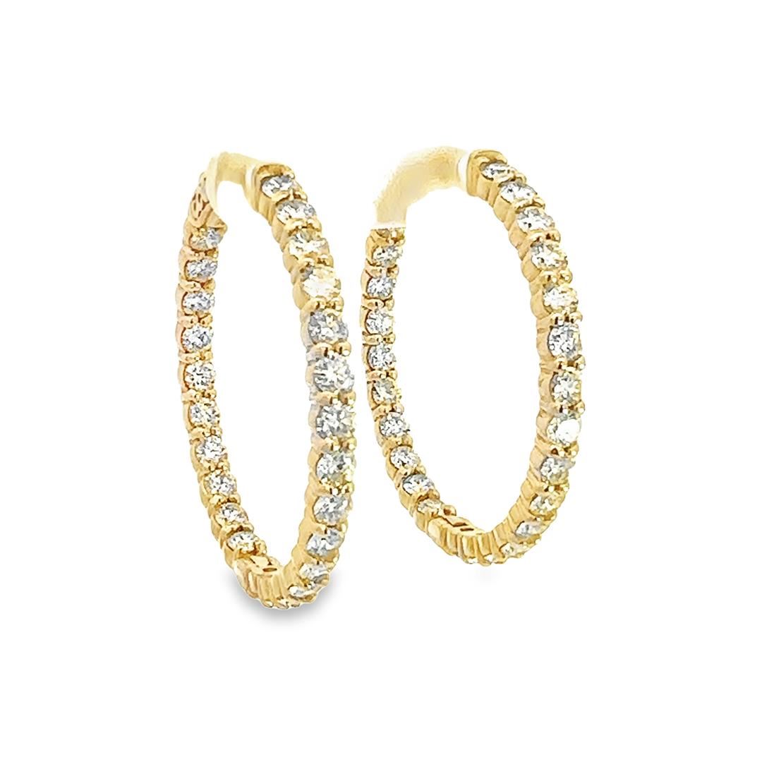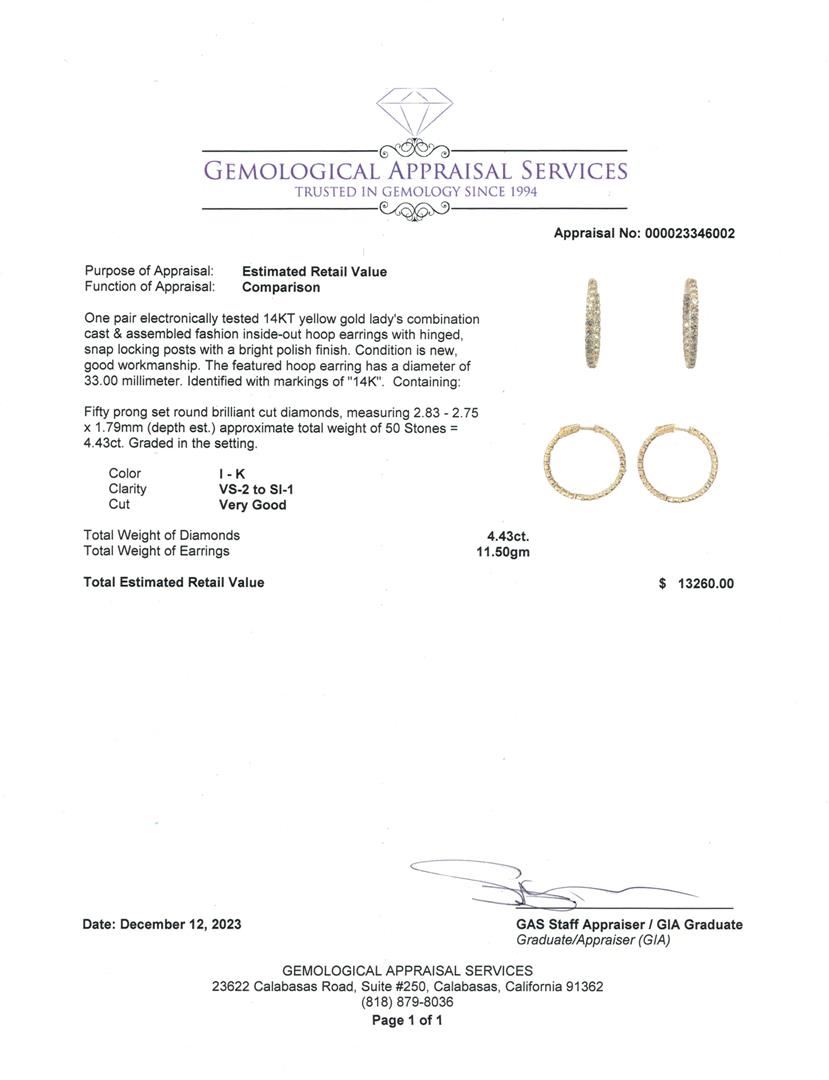 One pair electronically tested 14KT yellow gold lady's combination cast & assembled fashion inside-out hoop earrings with hinged, snap locking posts with a bright polish finish. The featured hoop earring has a diameter of 33.00 millimeter. Identified with markings of "14K". Condition is new, good workmanship. Containing: Fifty prong set round brilliant cut diamonds, measuring 2.83 - 2.75 x 1.79mm (depth est.) approximate total weight of 50 Stones = 4.43ct. Graded in the setting. Color I - K Clarity VS-2 to SI-1 Cut Very Good Total Weight of Diamonds 4.43ct. Total Weight of Earrings 11.50gm Estimated Retail Value $ 13260.00