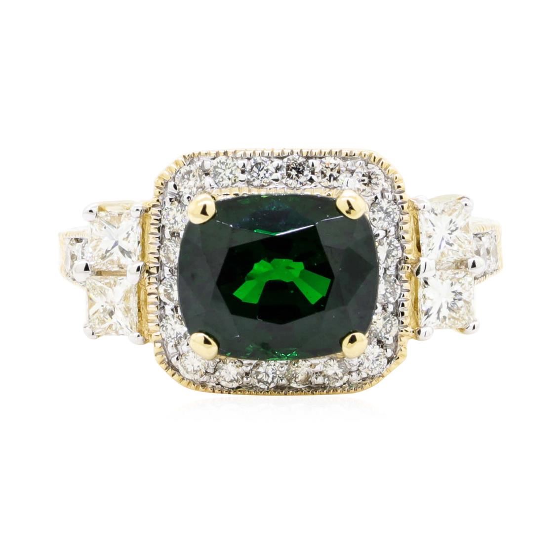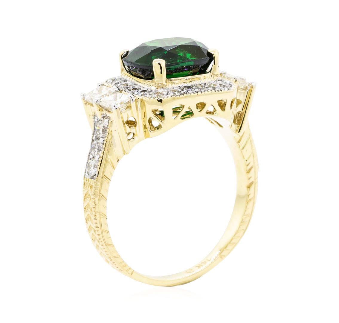 One electronically tested 14KT yellow gold lady's cast fashion ring with a cathedral shank with a bright polish with milgrain detailing finish. The featured lady's ring has hand engraved detailing and a shank measuring 1.98 millimeters wide. Identified with markings of '14K'. Condition is new, good workmanship. Containing: One prong set rectangular cushion modified mixed cut natural tsavorite garnet, measuring 9.20 x 7.63 x 5.93mm, (depth est.) approximate weight of 3.54ct., clarity is eye clean, medium dark, strong, green color, (GIA G 6/5), cut is very good. Transmitting light with no distortion, transparent. Colored gemstones are presumed to have been subjected to commonly used enhancement processes. Graded in the setting. Four prong set princess cut diamonds, measuring 2.80 x 2.70 x 2.03mm (depth est.) approximate total weight of 4 Stones = 0.50ct. Graded in the setting. Color H - I Clarity VS-1 to VS-2 Cut Very Good Six prong set round brilliant cut diamonds, measuring 2.00 - 1.90 x 1.21mm (depth est.) approximate total weight of 6 Stones = 0.18ct. Graded in the setting. Color H - I Clarity SI-1 to SI-2 Cut Good Twenty prong set round brilliant cut diamonds, measuring 1.50 - 1.40 x 0.87mm (depth est.) approximate total weight of 20 Stones = 0.22ct. Graded in the setting. Color H - I Clarity SI-1 to SI-2 Cut Good. Total Weight of Colored Stones 3.54ct.. Total Weight of Diamonds 0.90ct.. Total Weight of Ring 5.80gm GAS Appraised at $23150.00. GAS Appraised.