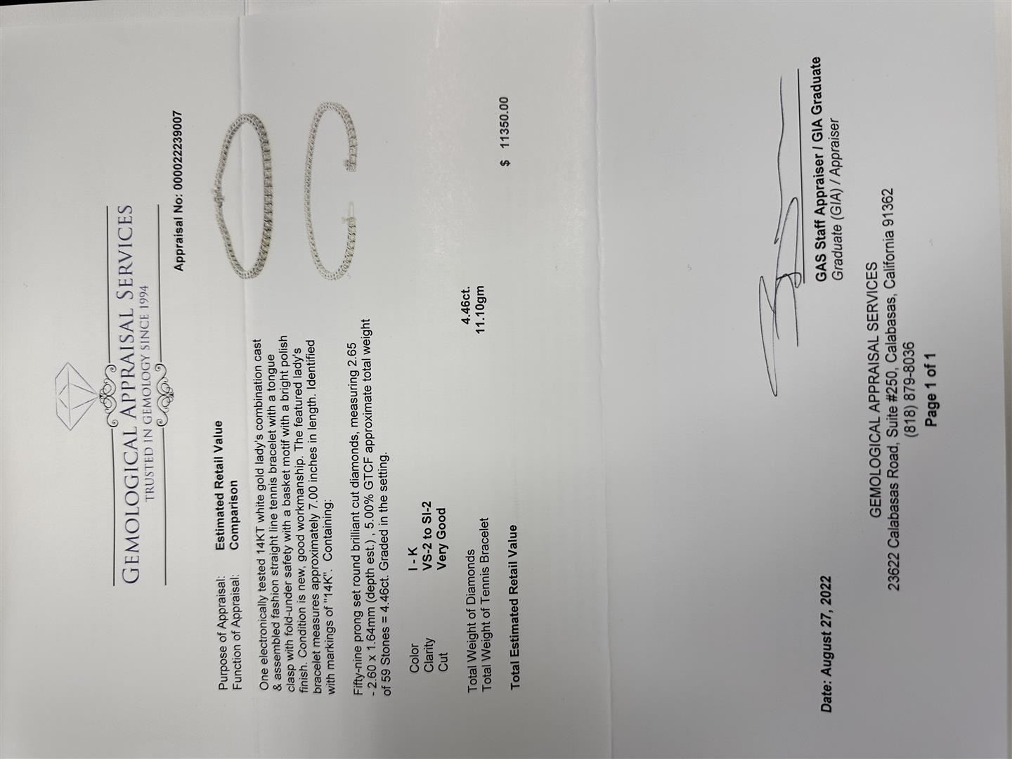 One electronically tested 14KT white gold lady's combination cast & assembled fashion straight line tennis bracelet with a tongue clasp with fold-under safety with a basket motif with a bright polish finish. Condition is new, good workmanship. The featured lady's bracelet measures approximately 7.00 inches in length. ldentified with markings of "14K". Containing: Fifty-nine prong set round brilliant cut diamonds, measuring 2.65 - 2.60 X 1.64mm (depth est.), 5.00% GTCF approximate total weight of 59 Stones = 4.46ct. Graded in the setting. VS-2 to SI-2. Very Good. Total weight of Diamonds 4.46ct. Estimated Retail Value $11350.00