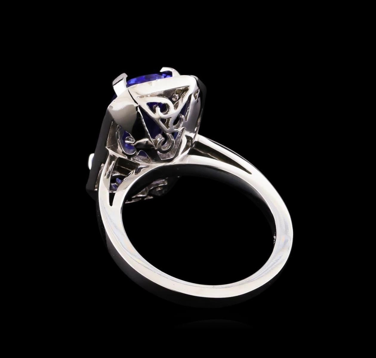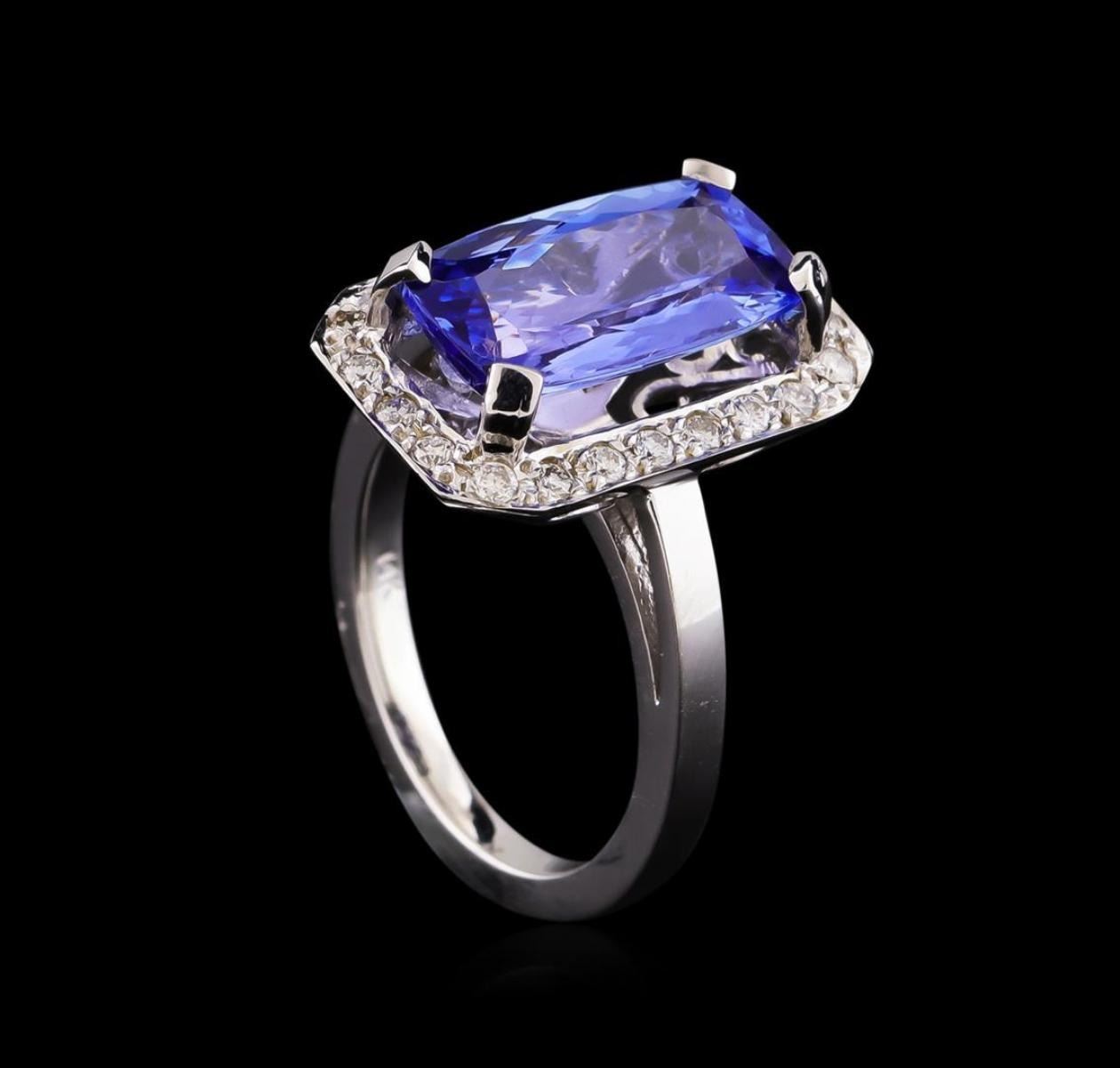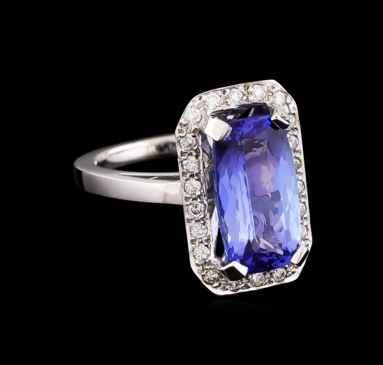One electronically tested 14KT white gold lady's cast fashion ring with a cathedral halo with a bright polish finish. The featured lady's ring has a shank measuring 1.99 millimeters wide. Identified with markings of "14K". Condition is new, good workmanship. Containing: One prong set rectangular cushion modified brilliant cut natural tanzanite, measuring 13.93 x 7.72 x 5.02mm, 5%. bulge factor, approximate weight of 4.47ct., clarity is eye clean, medium light, moderately strong, bluish violet color, (GIA bV 4/4), cut is very good. Transmitting light with no distortion, transparent. Colored gemstones are presumed to have been subjected to commonly used enhancement processes. Graded in the setting. Twenty-Two prong set round brilliant cut diamonds, measuring 1.60 - 1.50 x 0.96mm (depth est.) approximate total weight of 22 Stones = 0.32ct. Graded in the setting. Clarity: VS-2 to SI-2. Color: G - Good. Total Weight of Colored Stones 4.47ct. Total Weight of Diamonds 0.32ct. Total Weight of Ring 6.80gm. GAS Appraised.