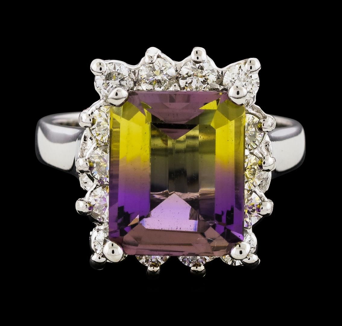 One Ametrine and Diamond Ring featuring: 14KT White Gold with a total weight of 5.72 grams, One Ametrine stone with a total weight of 4.48ct, and 14 Diamonds with a total weight of 0.90ctw.