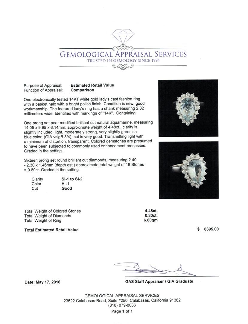 One electronically tested 14KT white gold lady's cast fashion ring with a basket halo with a bright polish finish. The featured lady's ring has a shank measuring 2.32 millimeters wide. Identified with markings of "14K". Condition is new, good workmanship. Containing: One prong set pear modified brilliant cut natural aquamarine, measuring 14.05 x 9.95 x 6.14mm, approximate weight of 4.48ct., clarity is slightly included, light, moderately strong, very slightly greenish blue color, (GIA vslgB 3/4), cut is very good. Transmitting light with a minimum of distortion, transparent. Colored gemstones are presumed to have been subjected to commonly used enhancement processes. Graded in the setting. Sixteen prong set round brilliant cut diamonds, measuring 2.40 - 2.30 x 1.46mm (depth est.) approximate total weight of 16 Stones = 0.80ct. Graded in the setting. Clarity: SI-1 to SI-2. Color: H - I. Cut Good. Total Weight of Colored Stones 4.48ct. Total Weight of Diamonds 0.80ct. Total Weight of Ring 6.80gm. GAS Appraised.