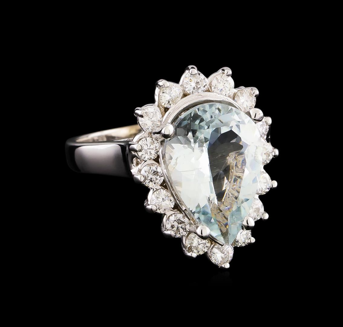 One electronically tested 14KT white gold lady's cast fashion ring with a basket halo with a bright polish finish. The featured lady's ring has a shank measuring 2.32 millimeters wide. Identified with markings of "14K". Condition is new, good workmanship. Containing: One prong set pear modified brilliant cut natural aquamarine, measuring 14.05 x 9.95 x 6.14mm, approximate weight of 4.48ct., clarity is slightly included, light, moderately strong, very slightly greenish blue color, (GIA vslgB 3/4), cut is very good. Transmitting light with a minimum of distortion, transparent. Colored gemstones are presumed to have been subjected to commonly used enhancement processes. Graded in the setting. Sixteen prong set round brilliant cut diamonds, measuring 2.40 - 2.30 x 1.46mm (depth est.) approximate total weight of 16 Stones = 0.80ct. Graded in the setting. Clarity: SI-1 to SI-2. Color: H - I. Cut Good. Total Weight of Colored Stones 4.48ct. Total Weight of Diamonds 0.80ct. Total Weight of Ring 6.80gm. GAS Appraised.