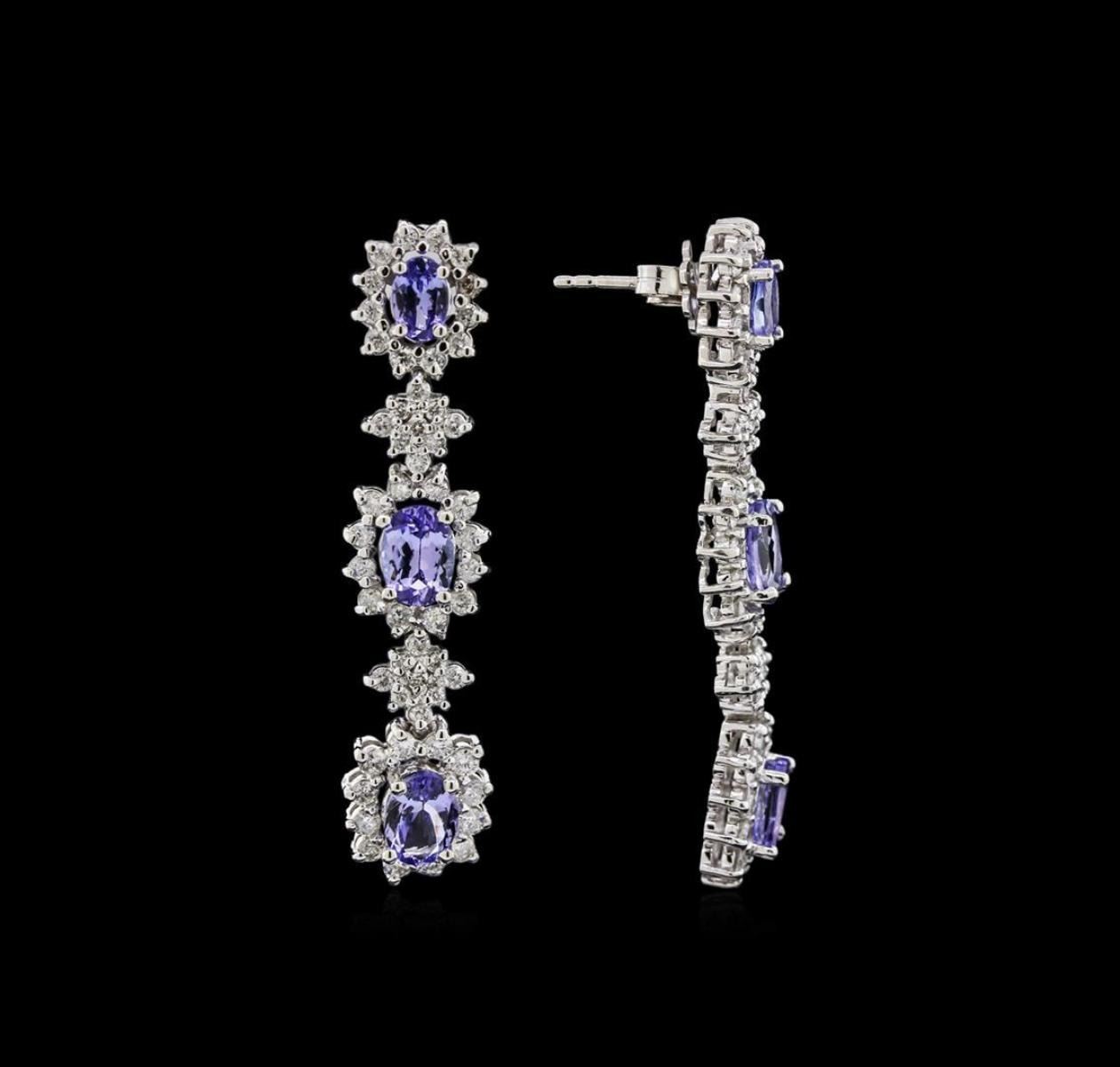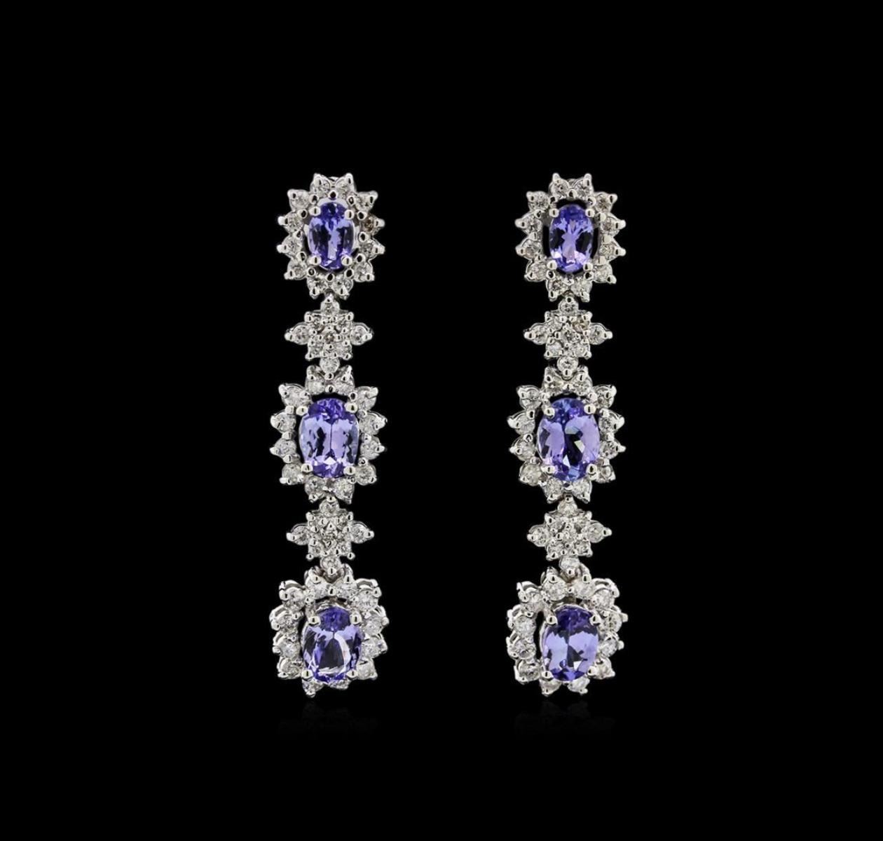 One pair electronically tested 14KT white gold lady's combination cast & assembled fashion earrings with friction posts with a bright polish finish. Identified with markings of "585". Condition is new, good workmanship. Containing: Four prong set oval modified brilliant cut natural tanzanites, measuring 7.15 x 5.15 x 3.07mm, 8% bulge factor, approximate total weight of 3.48ct., clarity is eye clean, type I, medium light, very slightly grayish, bluish violet color, (GIA bV 4/3), cut is good. Transmitting light with no distortion, transparent. Colored gemstones are presumed to have been subjected to commonly used enhancement processes. Graded in the setting. Two prong set oval modified brilliant cut natural tanzanites, measuring 5.60 x 4.07 x 2.69mm, 8% bulge factor, approximate total weight of 1.00ct., clarity is eye clean, type I, medium light, very slightly grayish, bluish violet color, (GIA bV 4/3), cut is good. Transmitting light with no distortion, transparent. Colored gemstones are presumed to have been subjected to commonly used enhancement processes. Graded in the setting. One Hundred Eight prong set round brilliant cut diamonds, measuring 1.80 - 1.70 x 1.12mm (depth est.) approximate total weight of 108 Stones = 2.28ct. Graded in the setting. Clarity: SI-2 to I-1. Color: H - I. Cut Good. Total Weight of Colored Stones 4.48ct. Total Weight of Diamonds 2.28ct. Total Weight of Earrings 11.40gm. GAS Appraised.