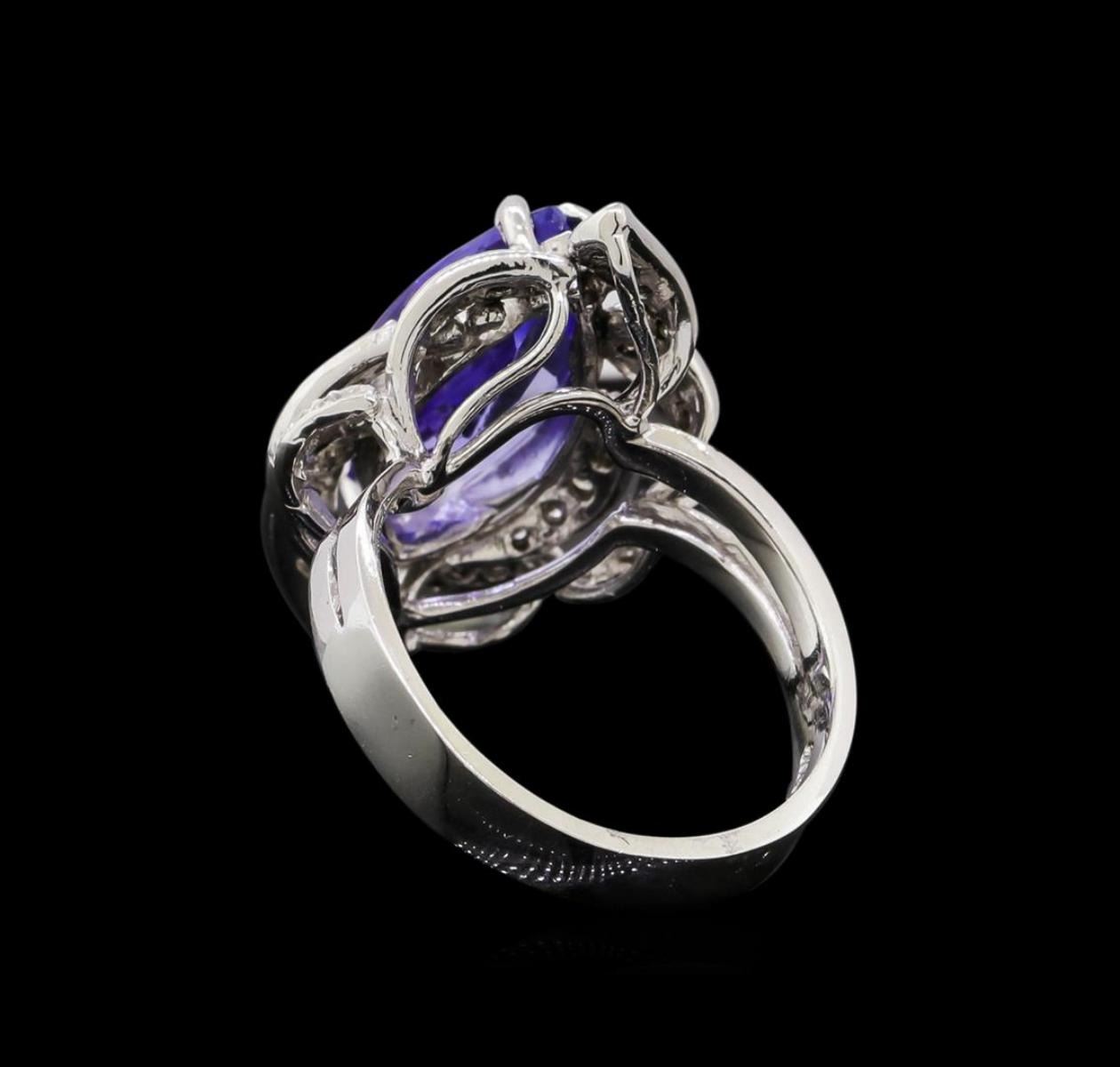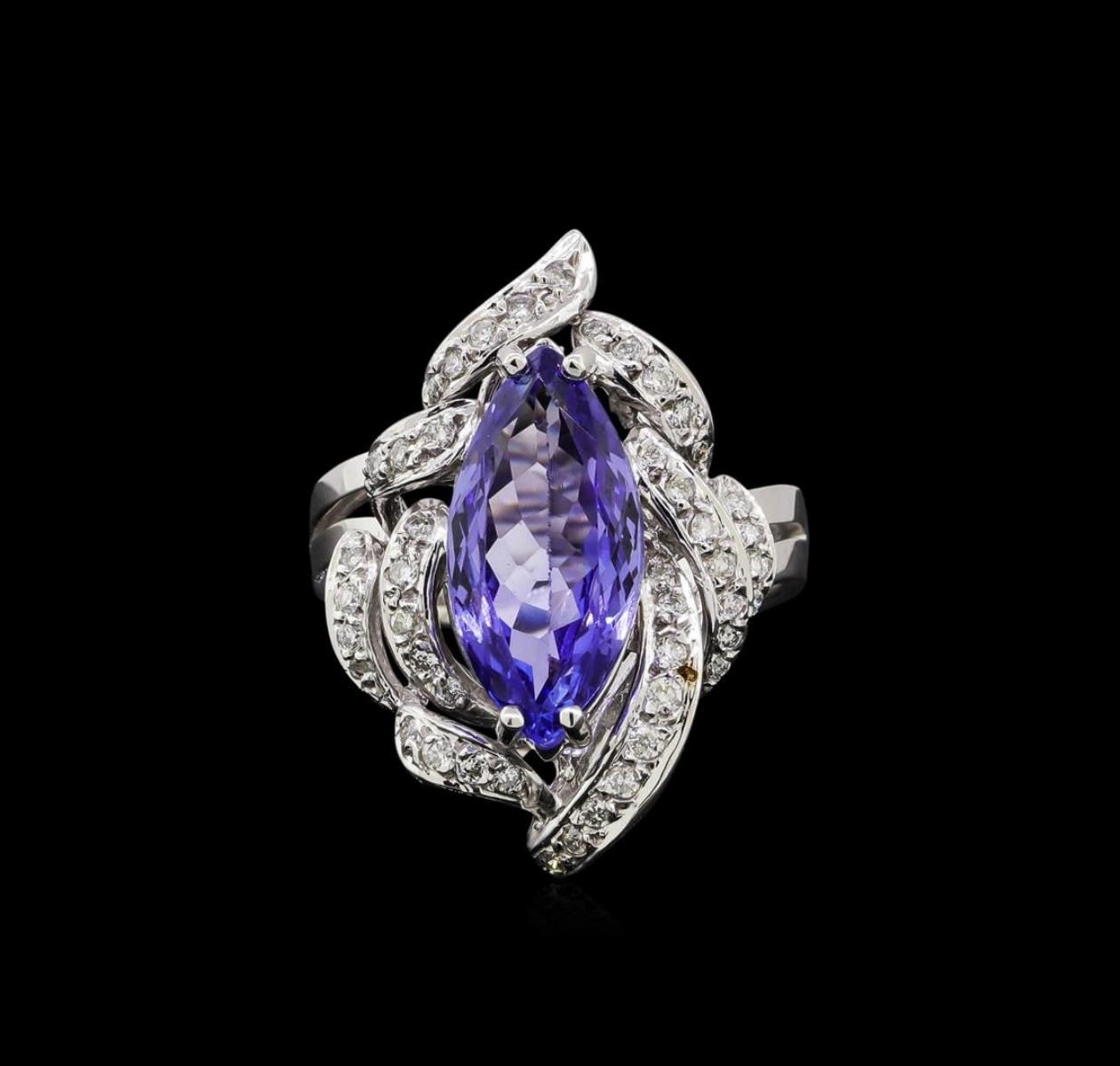 One electronically tested 14KT white gold lady's cast fashion ring with a freeform motif with a bright polish finish. The featured lady's ring has a shank measuring 3.40 millimeters in width. Identified with markings of 'K14'. Condition is new, good workmanship. Containing: One prong set marquise modified brilliant cut natural tanzanite, measuring 15.58 x 7.65 x 4.97mm, (depth est.) 15%. bulge factor, approximate weight of 4.52ct., clarity is eye clean, light, moderately strong, bluish violet color, (GIA bV 3/4), cut is good. Graded in the setting. Forty-Six prong set round brilliant cut diamonds, measuring 1.35 - 1.30 x 0.82mm (depth est.) approximate total weight of 46 Stones = 0.40ct. Graded in the setting. Clarity SI-1 to SI-2. Color: H - I Cut Good. Total Weight of Colored Stones 4.52ct.. Total Weight of Diamonds 0.40ct.. Total Weight of Ring 7.50gm. GAS Appraised at $6,815.00.