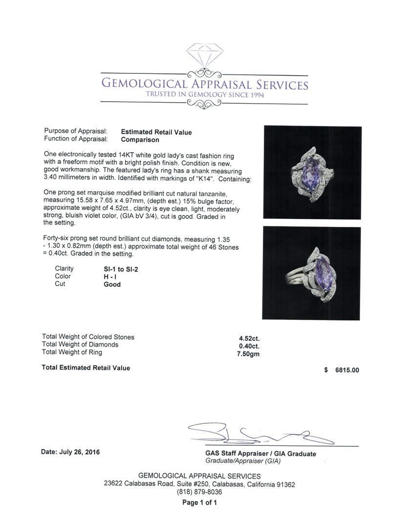 One electronically tested 14KT white gold lady's cast fashion ring with a freeform motif with a bright polish finish. The featured lady's ring has a shank measuring 3.40 millimeters in width. Identified with markings of 'K14'. Condition is new, good workmanship. Containing: One prong set marquise modified brilliant cut natural tanzanite, measuring 15.58 x 7.65 x 4.97mm, (depth est.) 15%. bulge factor, approximate weight of 4.52ct., clarity is eye clean, light, moderately strong, bluish violet color, (GIA bV 3/4), cut is good. Graded in the setting. Forty-Six prong set round brilliant cut diamonds, measuring 1.35 - 1.30 x 0.82mm (depth est.) approximate total weight of 46 Stones = 0.40ct. Graded in the setting. Clarity SI-1 to SI-2. Color: H - I Cut Good. Total Weight of Colored Stones 4.52ct.. Total Weight of Diamonds 0.40ct.. Total Weight of Ring 7.50gm. GAS Appraised.