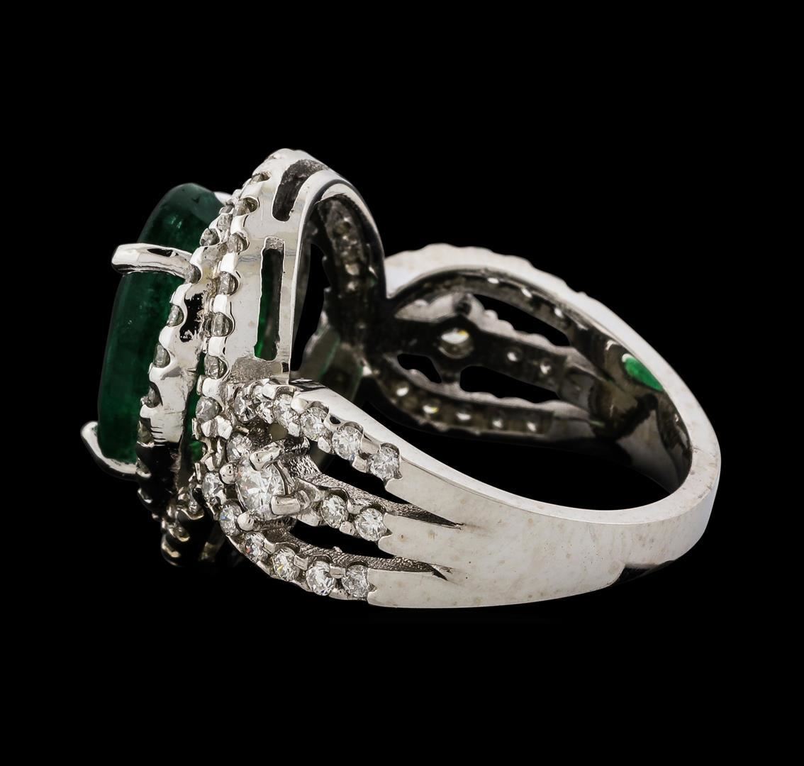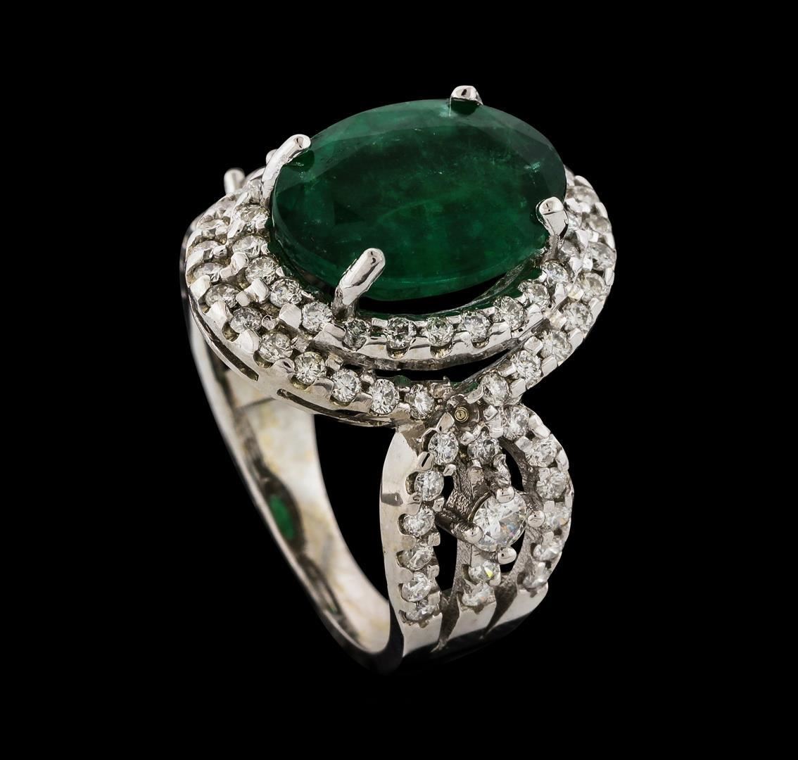 One electronically tested 14KT white gold lady's cast fashion ring with a triple split crossover shank with a bright polish finish. The featured lady's ring has a shank measuring 2.60 millimeters wide. Identified with markings of 'K14'. Condition is new, good workmanship. Containing: One prong set oval modified mixed cut natural emerald, measuring 12.65 x 9.50 x 5.50mm, (depth est.) 20%. bulge factor, approximate weight of 4.54ct., clarity is heavily included, medium, moderately strong, green color, (GIA G 5/4), cut is good. Transmitting light somewhat diffusely, semi-transparent to translucent. Naturally occurring internal & external characteristics are present. Indications of oil residue. Colored gemstones are presumed to have been subjected to commonly used enhancement processes. Graded in the setting. Two prong set round brilliant cut diamonds, measuring 2.70 - 2.60 x 1.64mm (depth est.) approximate total weight of 2 Stones = 0.14ct. Graded in the setting. Clarity SI-2. Color: H Cut Good Eighty-Four prong set round brilliant cut diamonds, measuring 1.50 - 1.40 x 0.90mm (depth est.) approximate total weight of 84 Stones = 1.00ct. Graded in the setting. Clarity SI-1 to SI-2. Color: G - H Cut Good. Total Weight of Colored Stones 4.54ct.. Total Weight of Diamonds 1.14ct.. Total Weight of Ring 7.60gm. GAS Appraised.