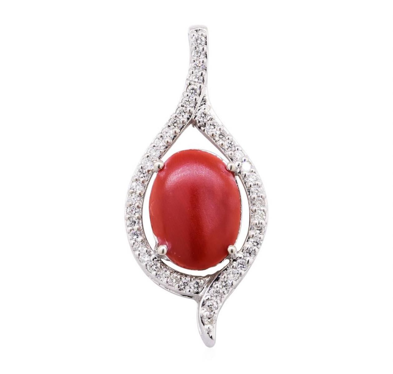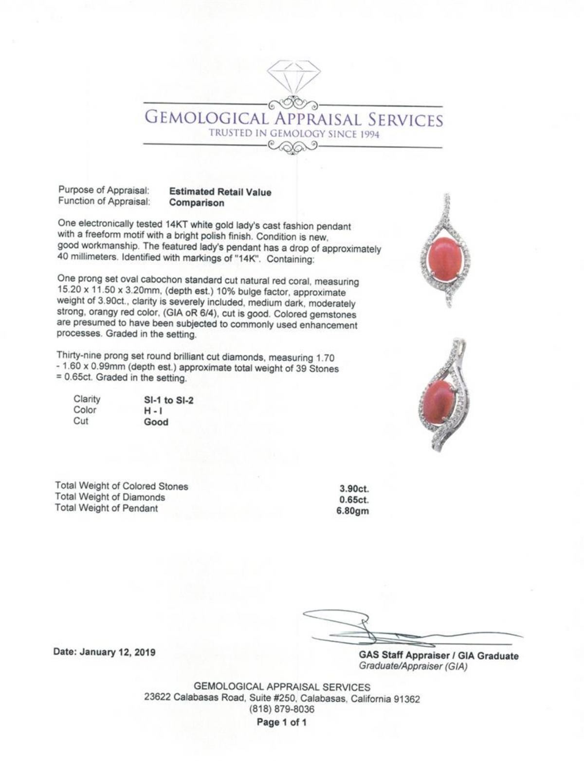 One electronically tested 14KT white gold lady's cast fashion pendant with a freeform motif with a bright polish finish. The featured lady's pendant has a drop of approximately 40 millimeters. Identified with markings of '14K'. Condition is new, good workmanship. Containing: One prong set oval cabochon standard cut natural red coral, measuring 15.20 x 11.50 x 3.20mm, (depth est.) 10%. bulge factor, approximate weight of 3.90ct., clarity is severely included, medium dark, moderately strong, orangy red color, (GIA oR 6/4), cut is good. Colored gemstones are presumed to have been subjected to commonly used enhancement processes. Graded in the setting. Thirty-Nine prong set round brilliant cut diamonds, measuring 1.70 - 1.60 x 0.99mm (depth est.) approximate total weight of 39 Stones = 0.65ct. Graded in the setting. Color H - I Clarity SI-1 to SI-2 Cut Good. Total Weight of Colored Stones 3.90ct.. Total Weight of Diamonds 0.65ct.. Total Weight of Pendant 6.80gm GAS Appraised at $3250.00. GAS Appraised at $3,250.00.
