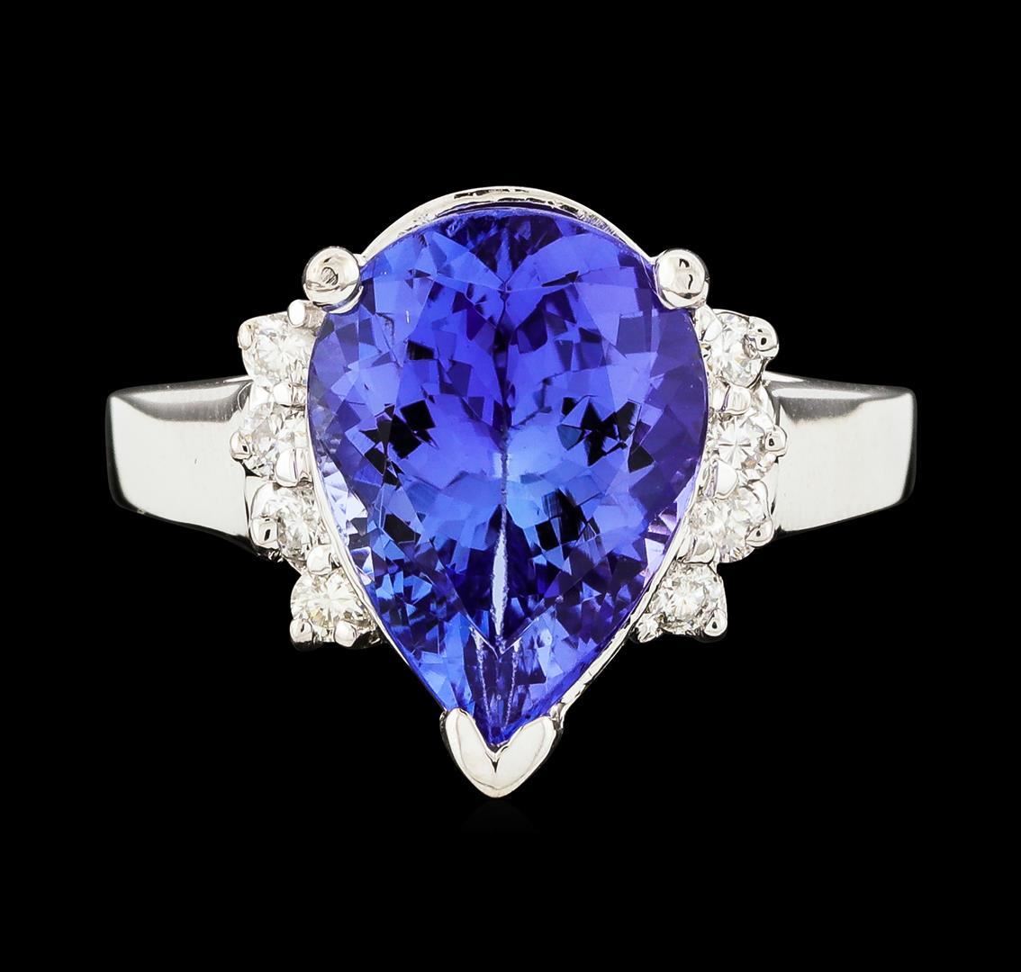 One electronically tested 14KT white gold lady's cast fashion ring with a cathedral shank with a bright polish finish. The featured lady's ring has diamond set shoulders and a shank measuring 2.55 millimeters wide. Identified with markings of '14K'. Condition is new, good workmanship. Containing: One prong set pear modified brilliant cut natural tanzanite, measuring 12.90 x 9.58 x 6.03mm, (depth est.) approximate weight of 4.56ct., clarity is eye clean, medium, moderately strong, bluish violet color, (GIA bV 5/4), cut is good. Transmitting light with no distortion, transparent. Colored gemstones are presumed to have been subjected to commonly used enhancement processes. Graded in the setting. Eight prong set round brilliant cut diamonds, measuring 2.00 - 1.90 x 1.21mm (depth est.) approximate total weight of 8 Stones = 0.23ct. Graded in the setting. Clarity SI-1 to I-1. Color: H - I Cut Good. Total Weight of Colored Stones 4.56ct.. Total Weight of Diamonds 0.23ct.. Total Weight of Ring 5.50gm.