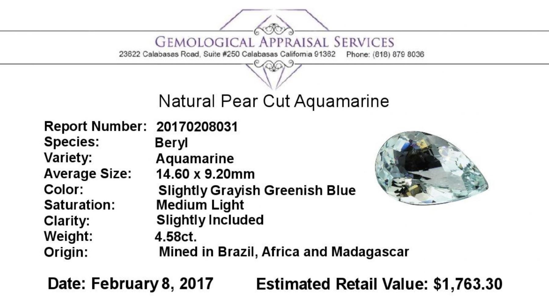 One natural pear cut aquamarine with an exact weight of 4.58ct., clarity is slightly included, slightly grayish greenish blue, medium light. Gemological Appraisals Services estimates the retail value at $1763.3 GAS Appraised.