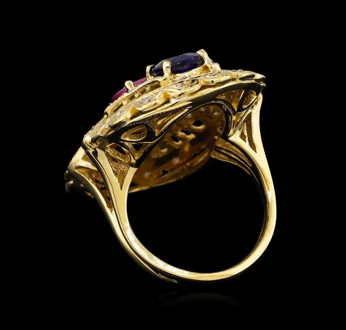 One electronically tested 14KT yellow gold ladies cast multicolor sapphire and diamond ring. The featured pink sapphire is set with two blue sapphires within an elaborate diamond gallery supported by split shoulders, completed by a two millimeter wide band. Bright polish and textured finish. Condition is new, good workmanship. Containing: One prong set oval mixed cut natural pink sapphire, measuring 9.00 x 6.70 x 2.60mm, approximate weight of 1.53ct., clarity is slightly included, medium, very slightly grayish, pink color, (GIA Pk 5/3), cut is good. Transmitting light with a minimum of distortion, transparent. Naturally occurring internal & external characteristics are present. Graded in the setting. Two prong set oval mixed cut natural blue sapphires approximate total weight of 3.05ct., clarity is heavily included, type II, dark, very slightly grayish, blue color, (GIA B 7/3), cut is good. Transmitting light somewhat diffusely, translucent. Naturally occurring internal & external characteristics are present. Indications of laboratory high temperature diffusion treatment. Color grade is an average for the pair. Graded in the setting. Forty-Four prong set round brilliant cut diamonds approximate total weight of 44 Stones = 0.92ct. Graded in the setting. Clarity: SI-1 to I-1. Color: E - G. Total Weight of Colored Stones 4.58ct. Total Weight of Diamonds 0.92ct. Total Weight of Ring 13.69gm. AIG Appraised.