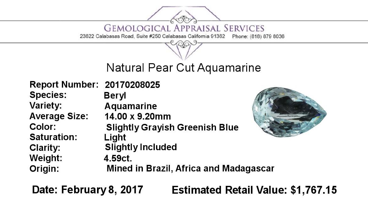 One natural pear cut aquamarine with an exact weight of 4.59ct., clarity is slightly included, slightly grayish greenish blue, light. Gemological Appraisals Services estimates the retail value at $1767.15 GAS Appraised.